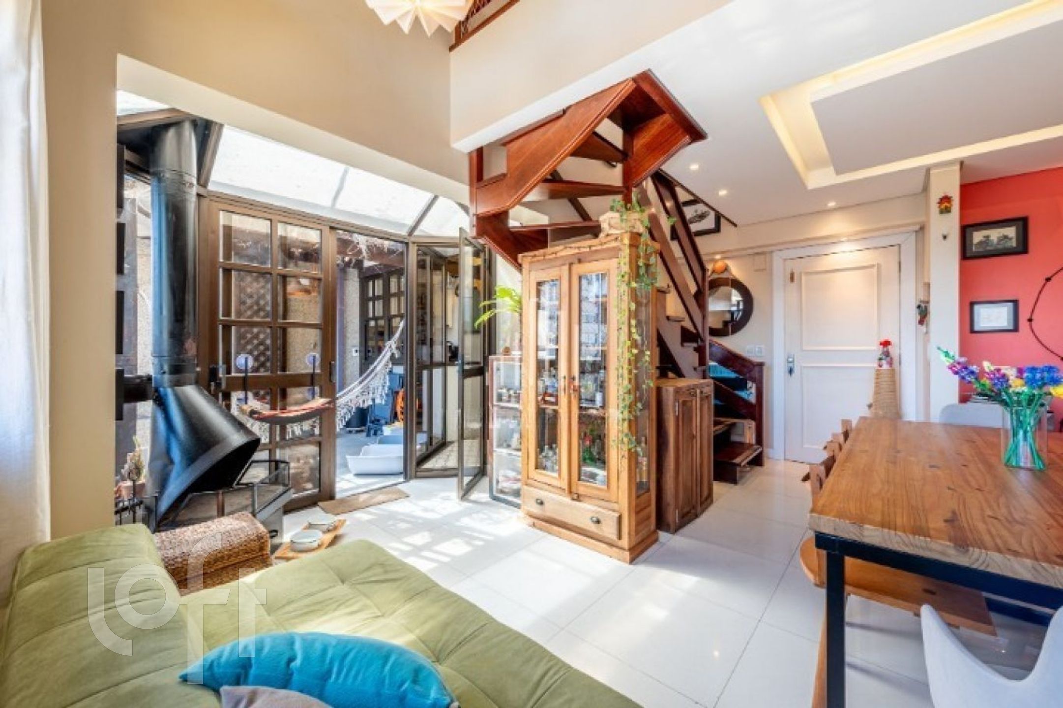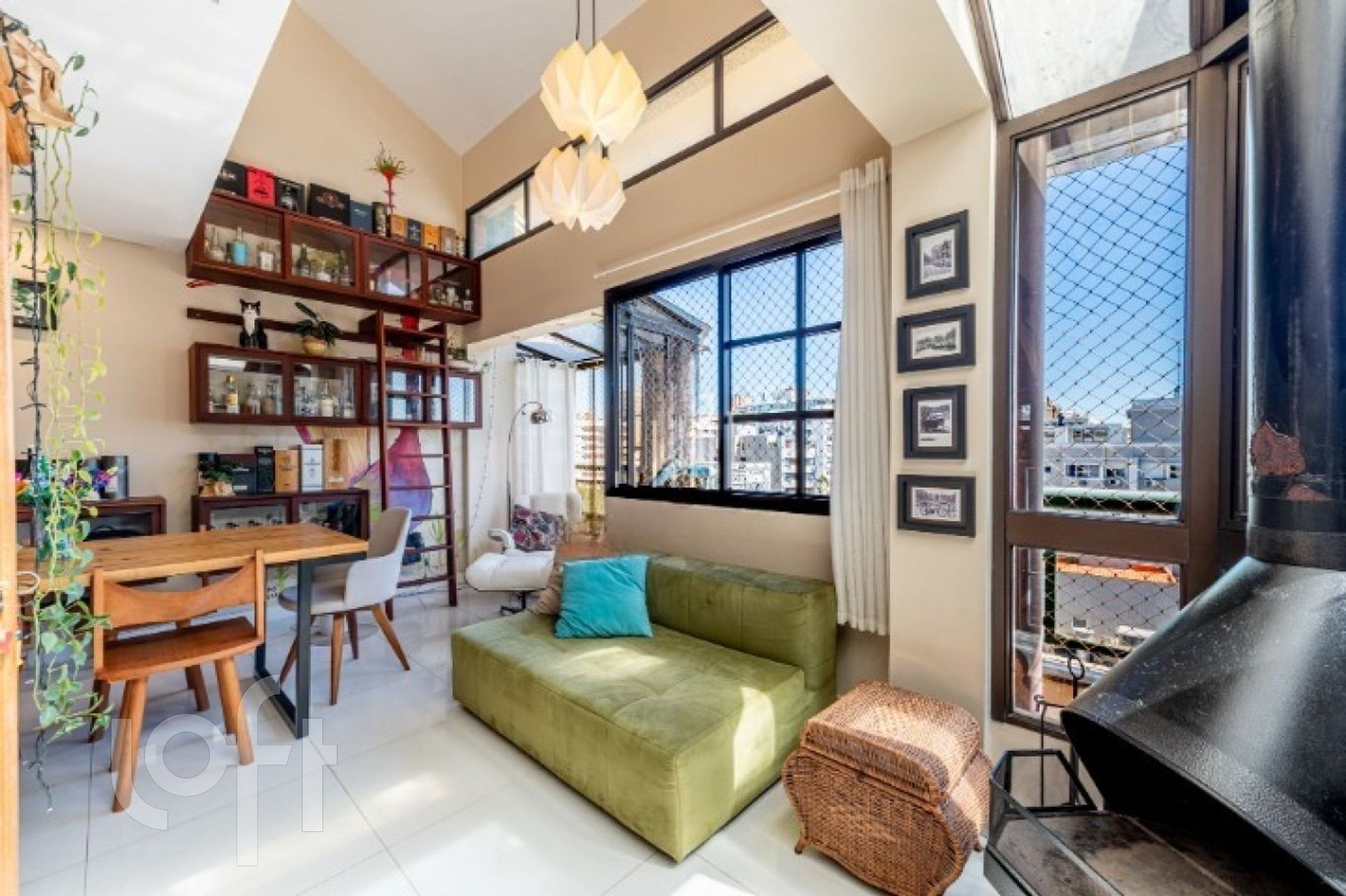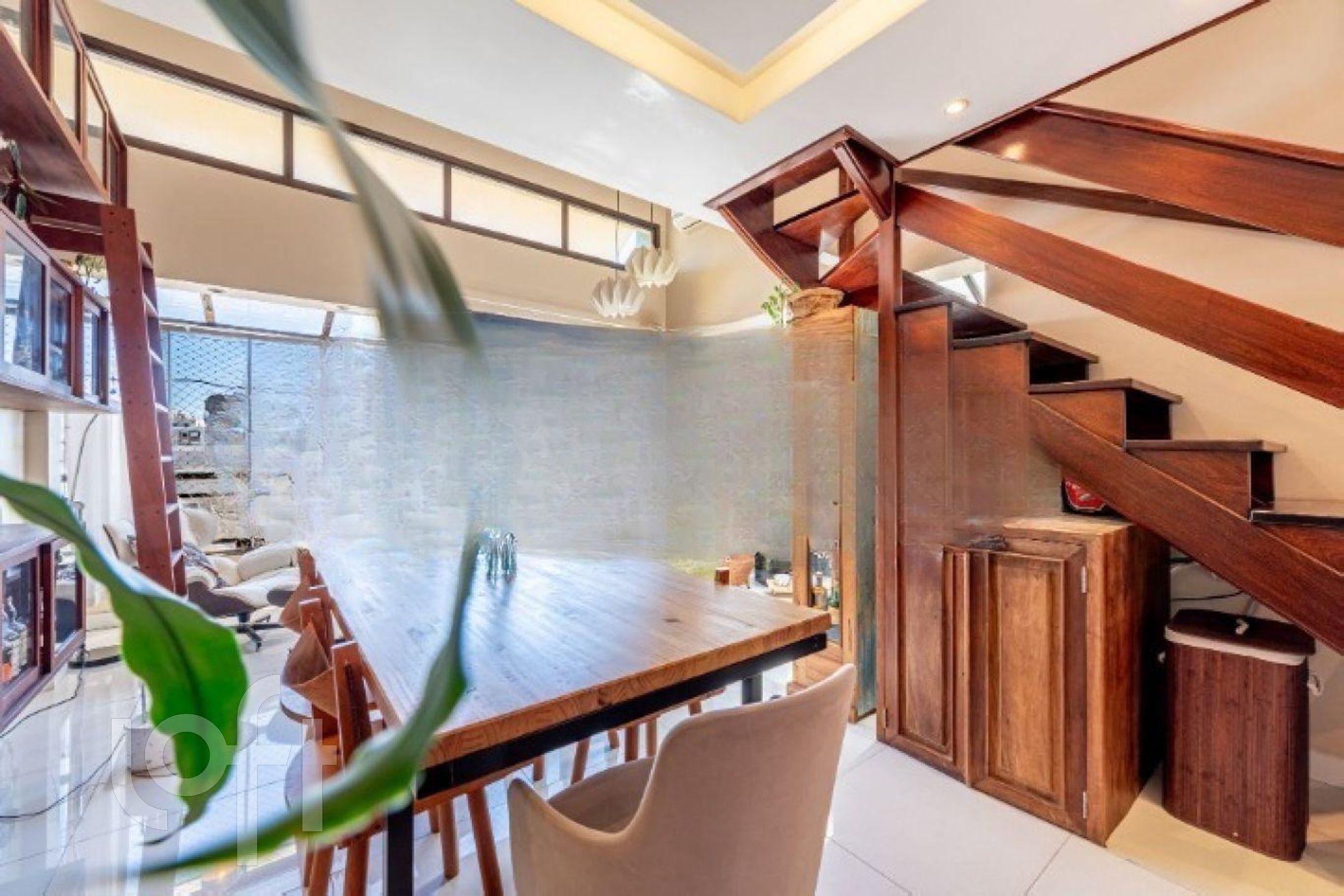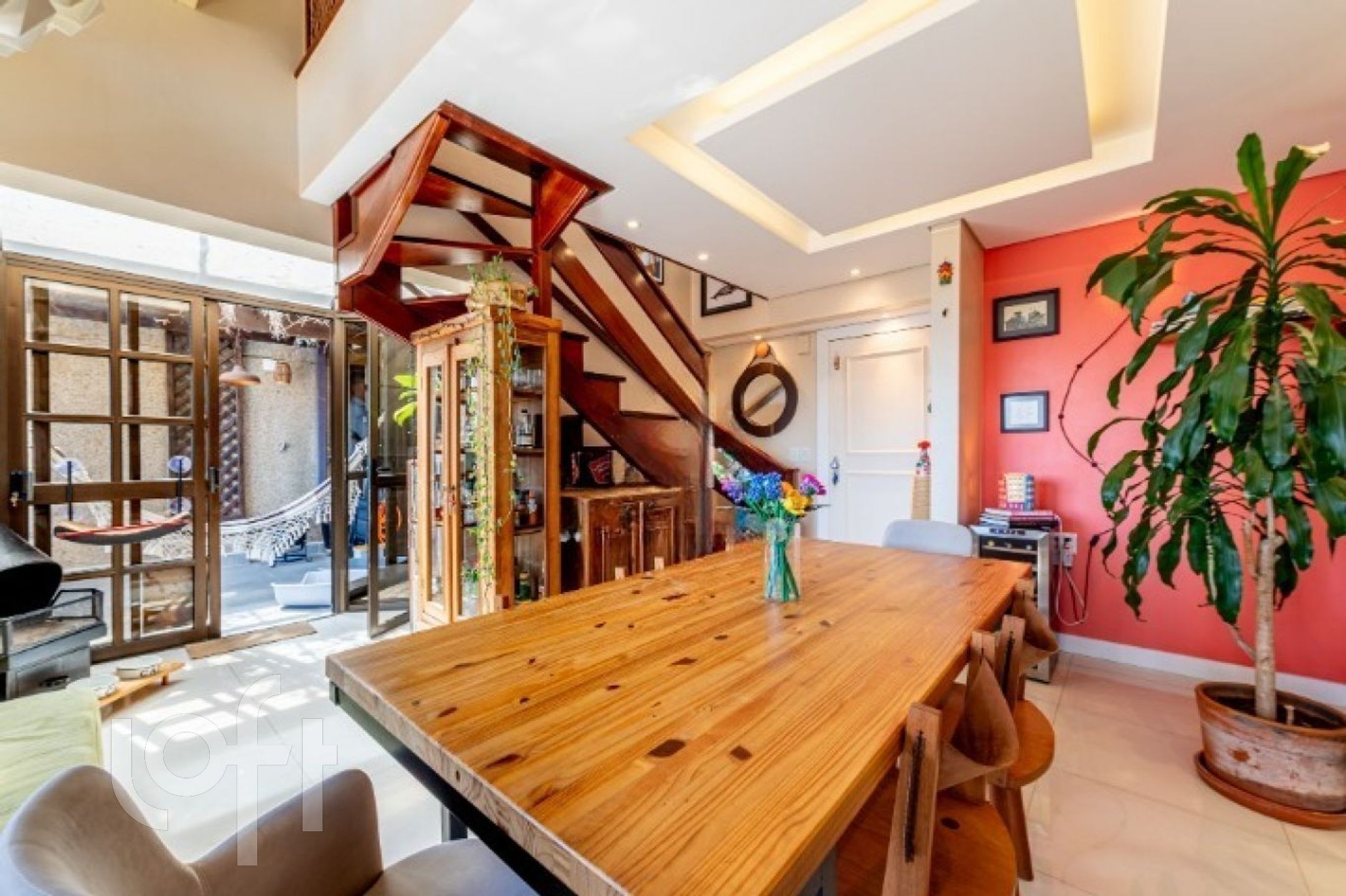 No primeiro pavimento, o imóvel conta com uma ampla sala de jantar com pé-direito duplo e sacada integrada, ideal para um espaço de leitura aconchegante. Possui lareira, cozinha fechada com móveis sob medida e churrasqueira tipo parrilla. A lavanderia foi inteligentemente embutida sob a escada, com máquina lava e seca. Há ainda uma charmosa área externa com pergolado e teto de vidro, proporcionando excelente iluminação natural e ventilação.