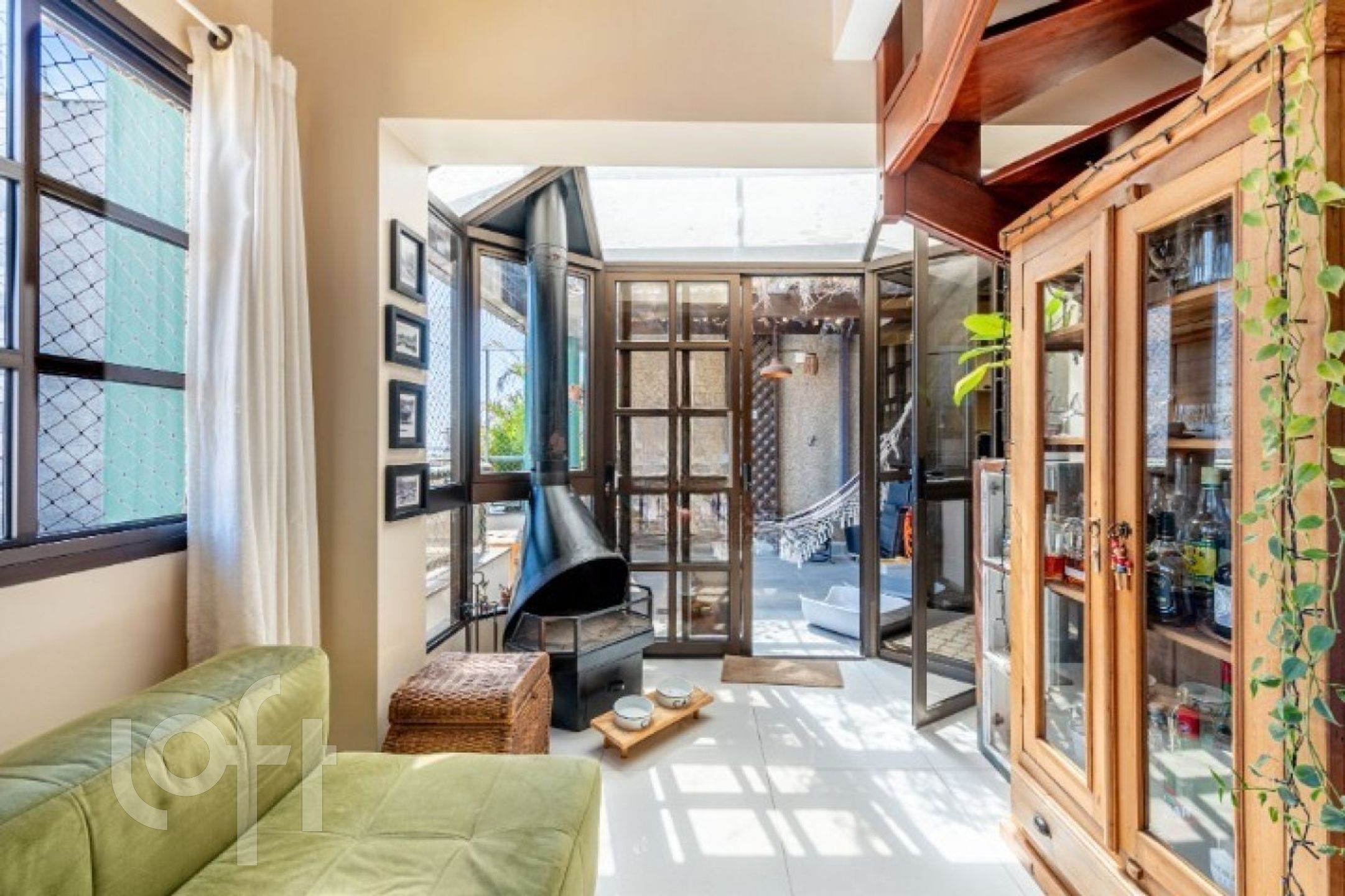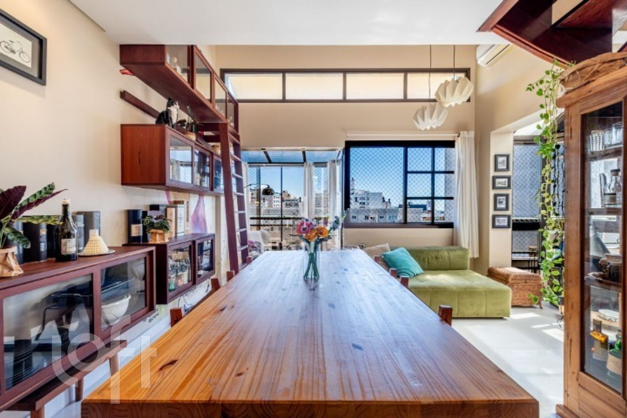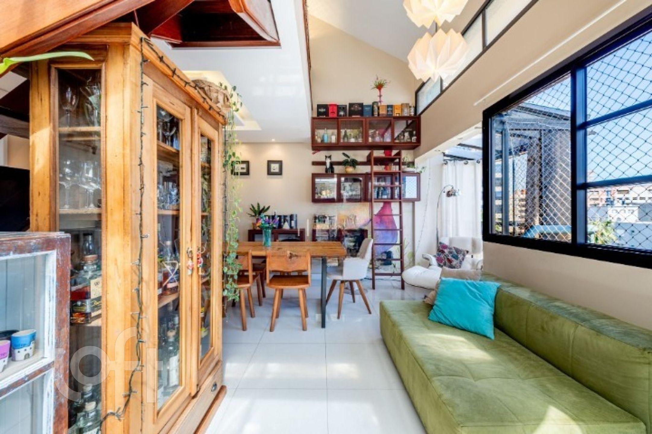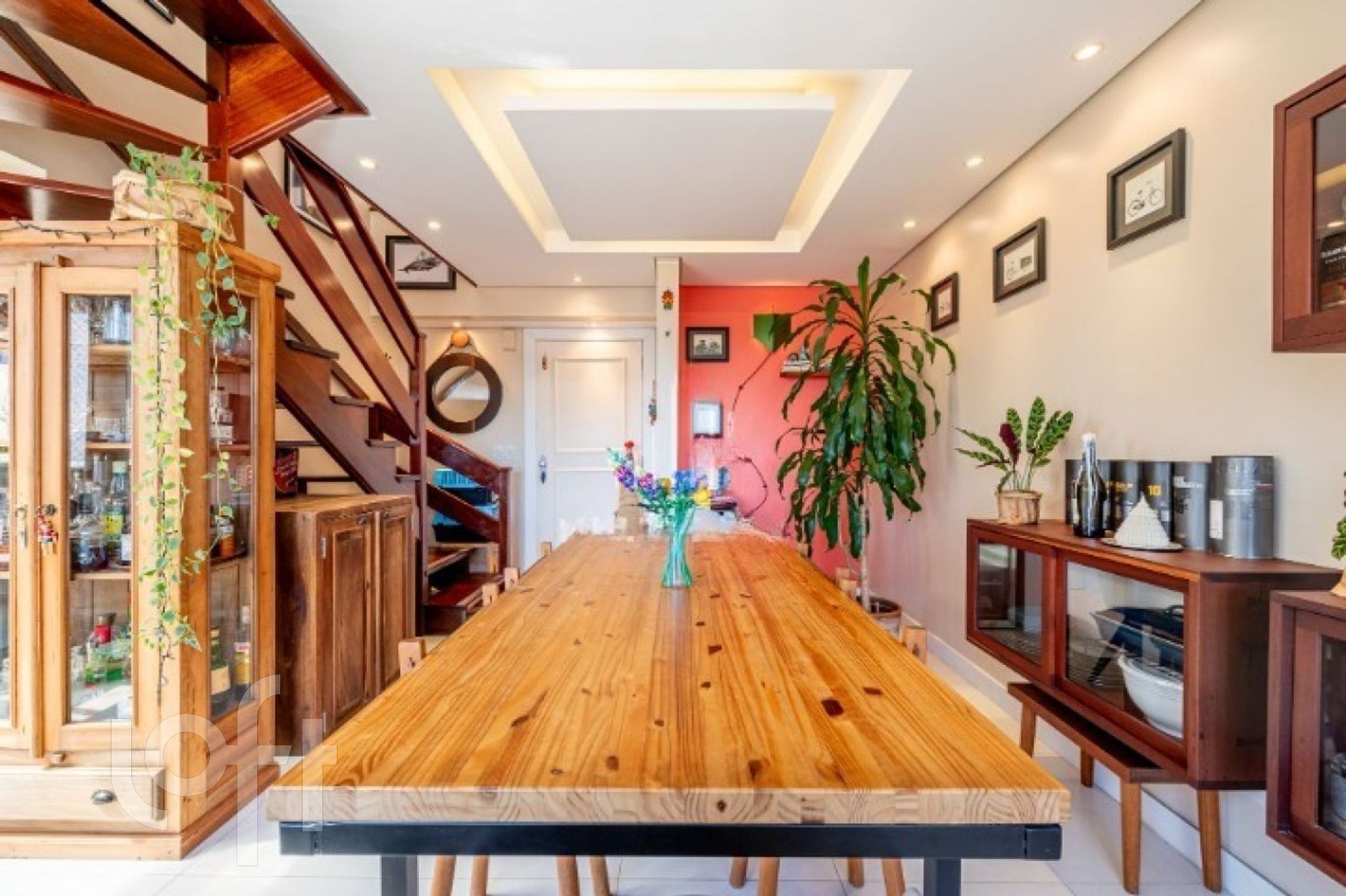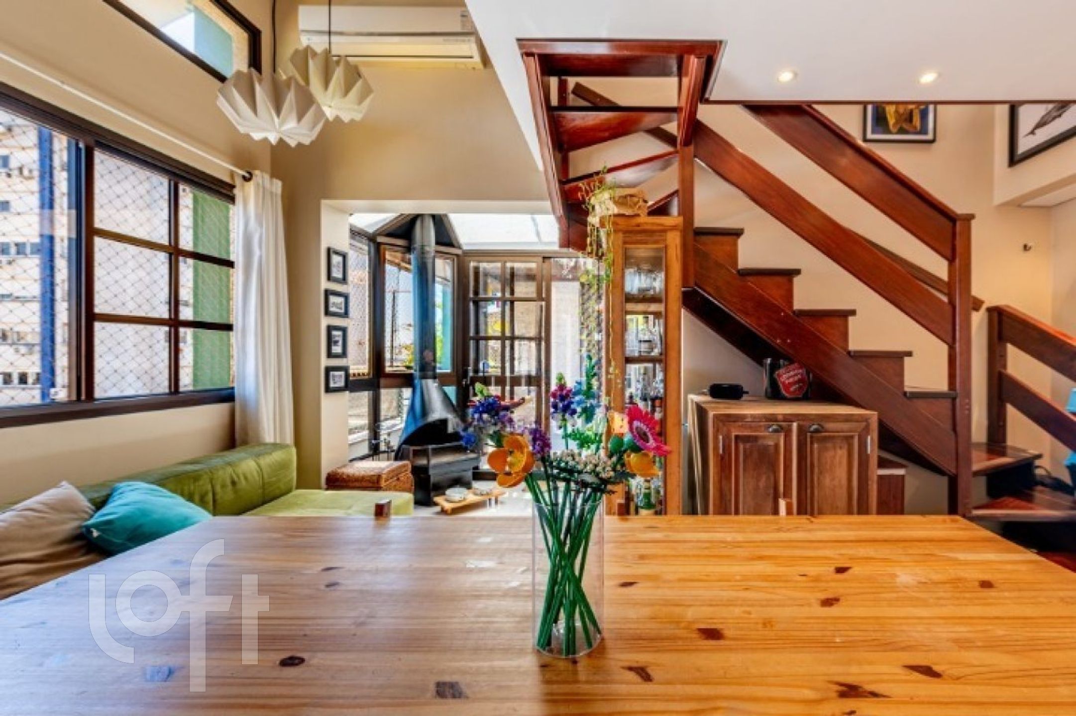 No primeiro pavimento, o imóvel conta com uma ampla sala de jantar com pé-direito duplo e sacada integrada, ideal para um espaço de leitura aconchegante. Possui lareira, cozinha fechada com móveis sob medida e churrasqueira tipo parrilla. A lavanderia foi inteligentemente embutida sob a escada, com máquina lava e seca. Há ainda uma charmosa área externa com pergolado e teto de vidro, proporcionando excelente iluminação natural e ventilação.