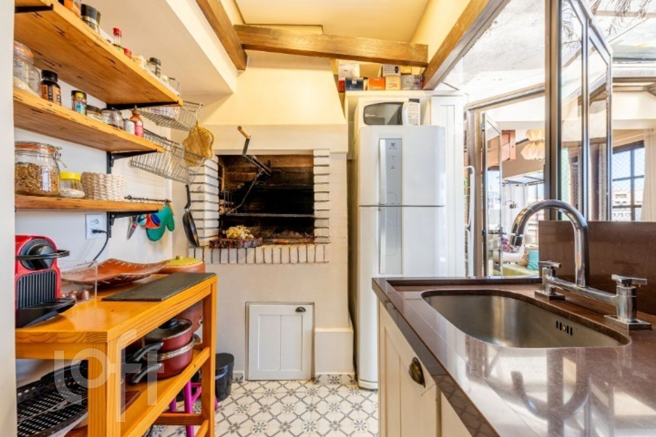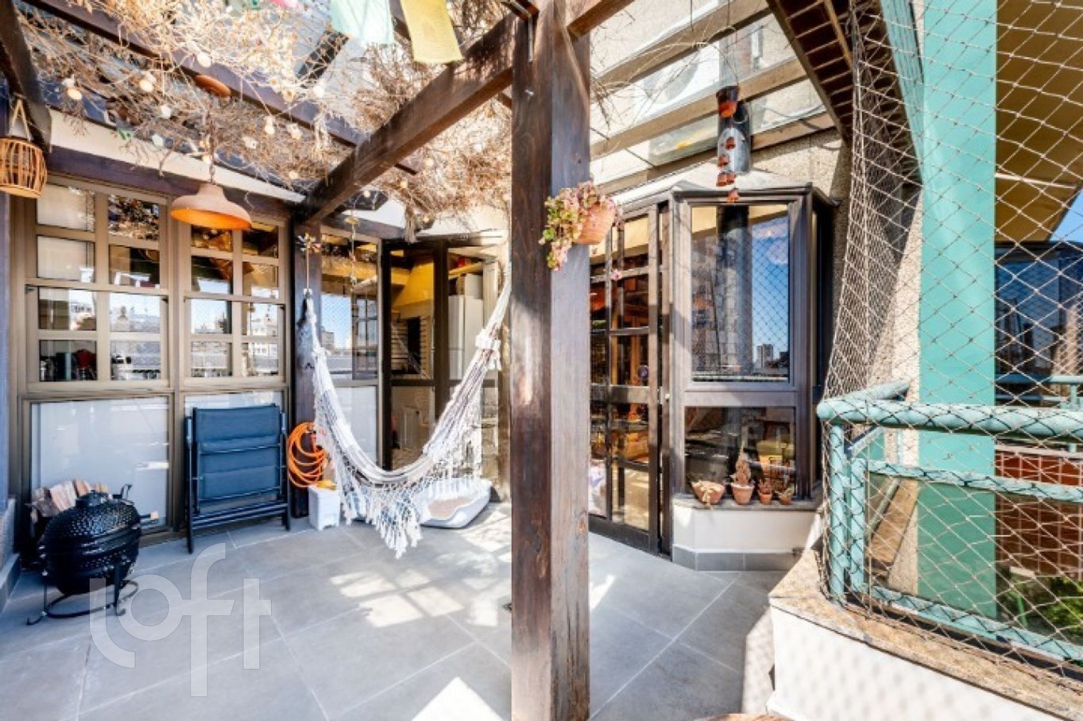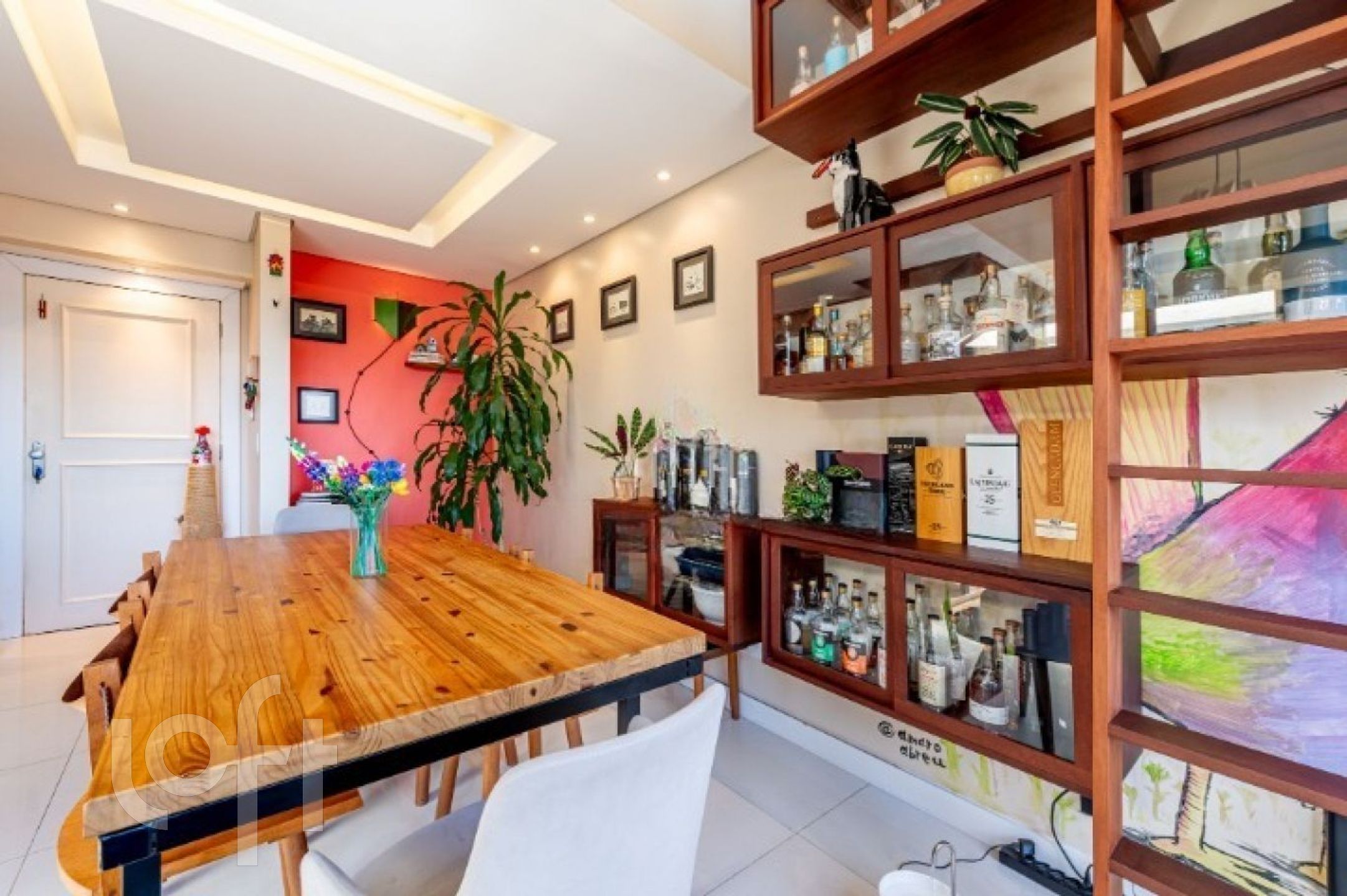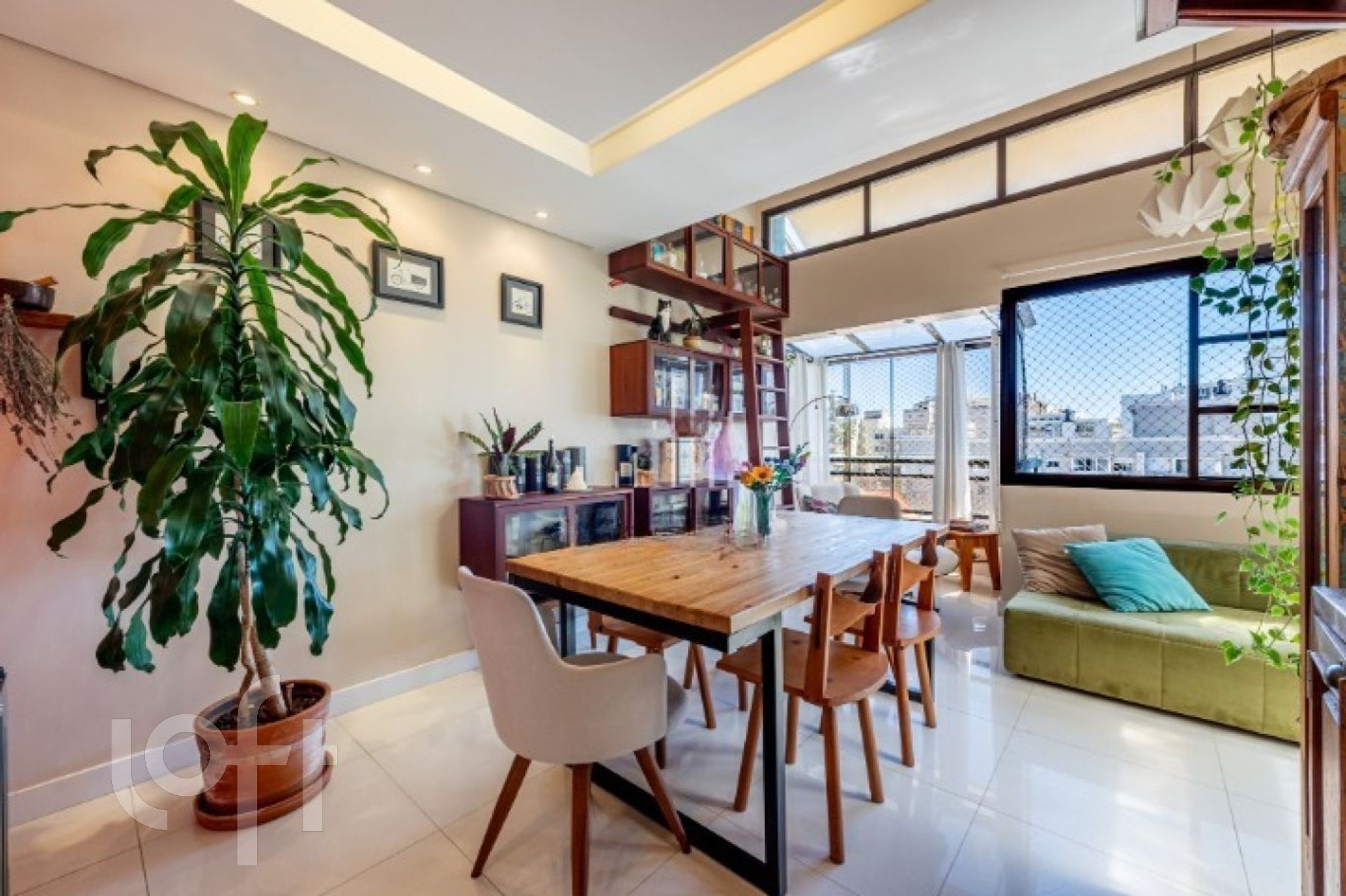 No primeiro pavimento, o imóvel conta com uma ampla sala de jantar com pé-direito duplo e sacada integrada, ideal para um espaço de leitura aconchegante. Possui lareira, cozinha fechada com móveis sob medida e churrasqueira tipo parrilla. A lavanderia foi inteligentemente embutida sob a escada, com máquina lava e seca. Há ainda uma charmosa área externa com pergolado e teto de vidro, proporcionando excelente iluminação natural e ventilação.