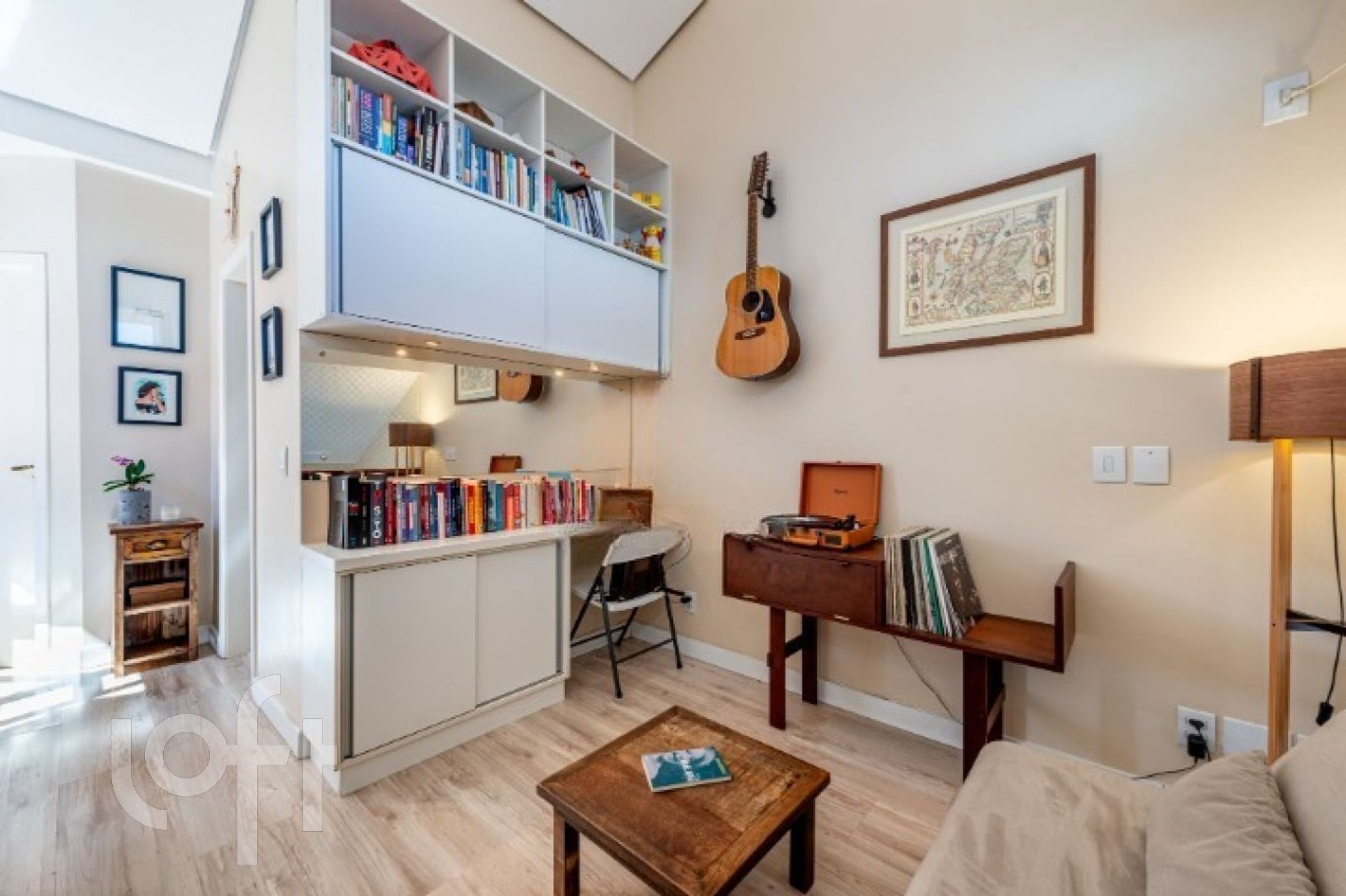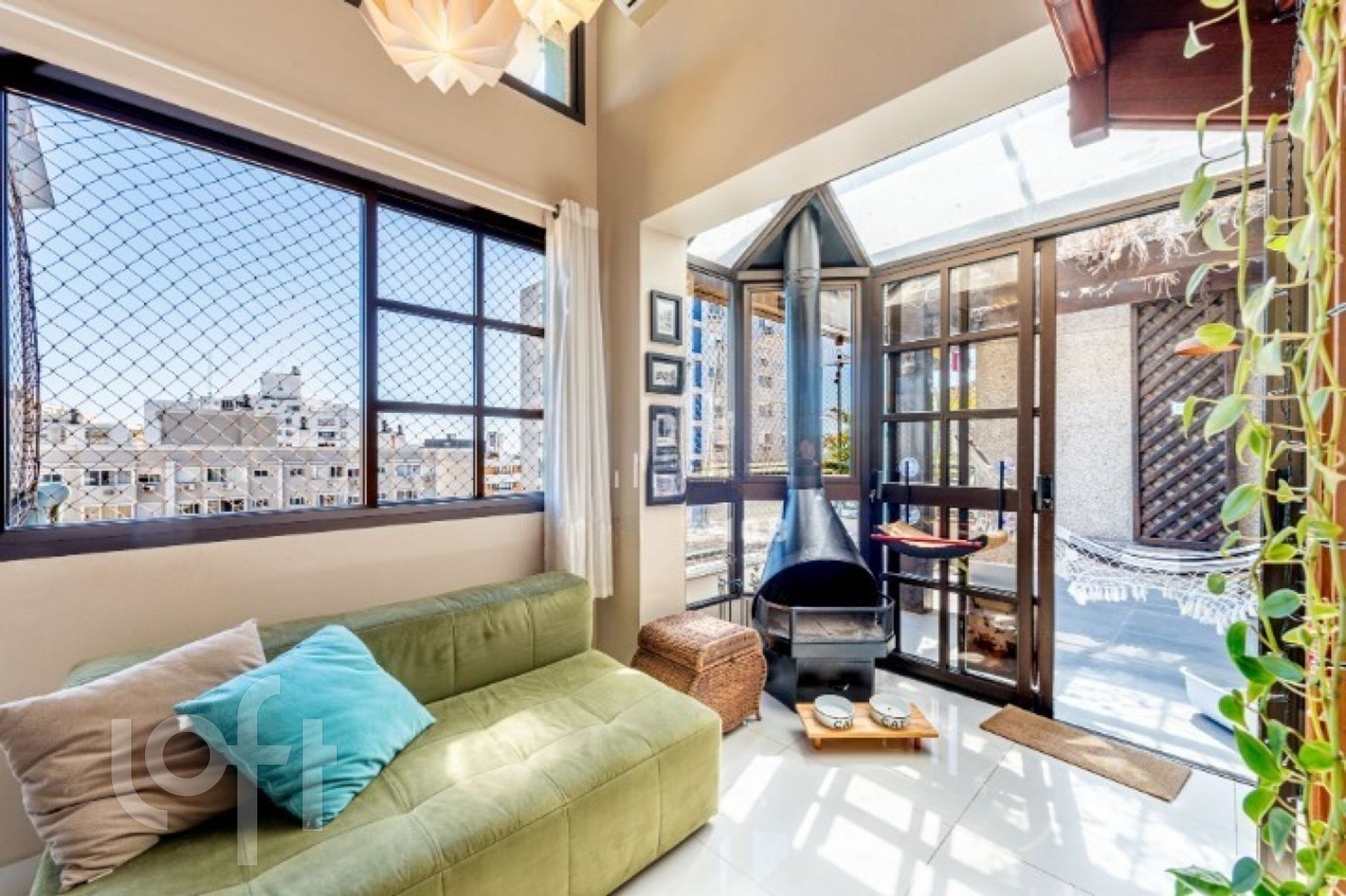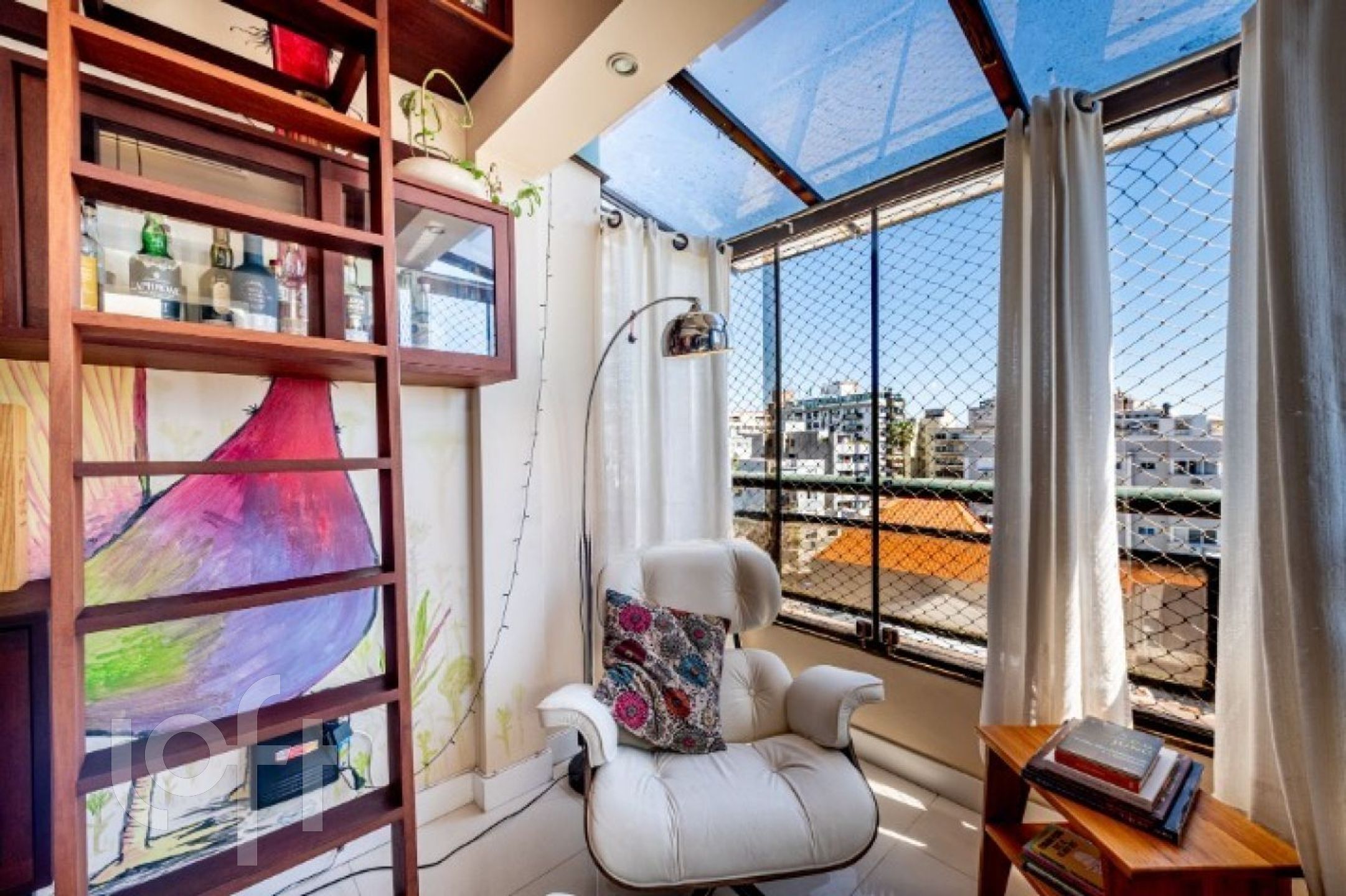 No segundo pavimento, o ambiente íntimo oferece uma sala de estar/TV também com pé-direito duplo, dois dormitórios e banheiro social com claraboia de vidro e abertura para ventilação, garantindo luminosidade e conforto.