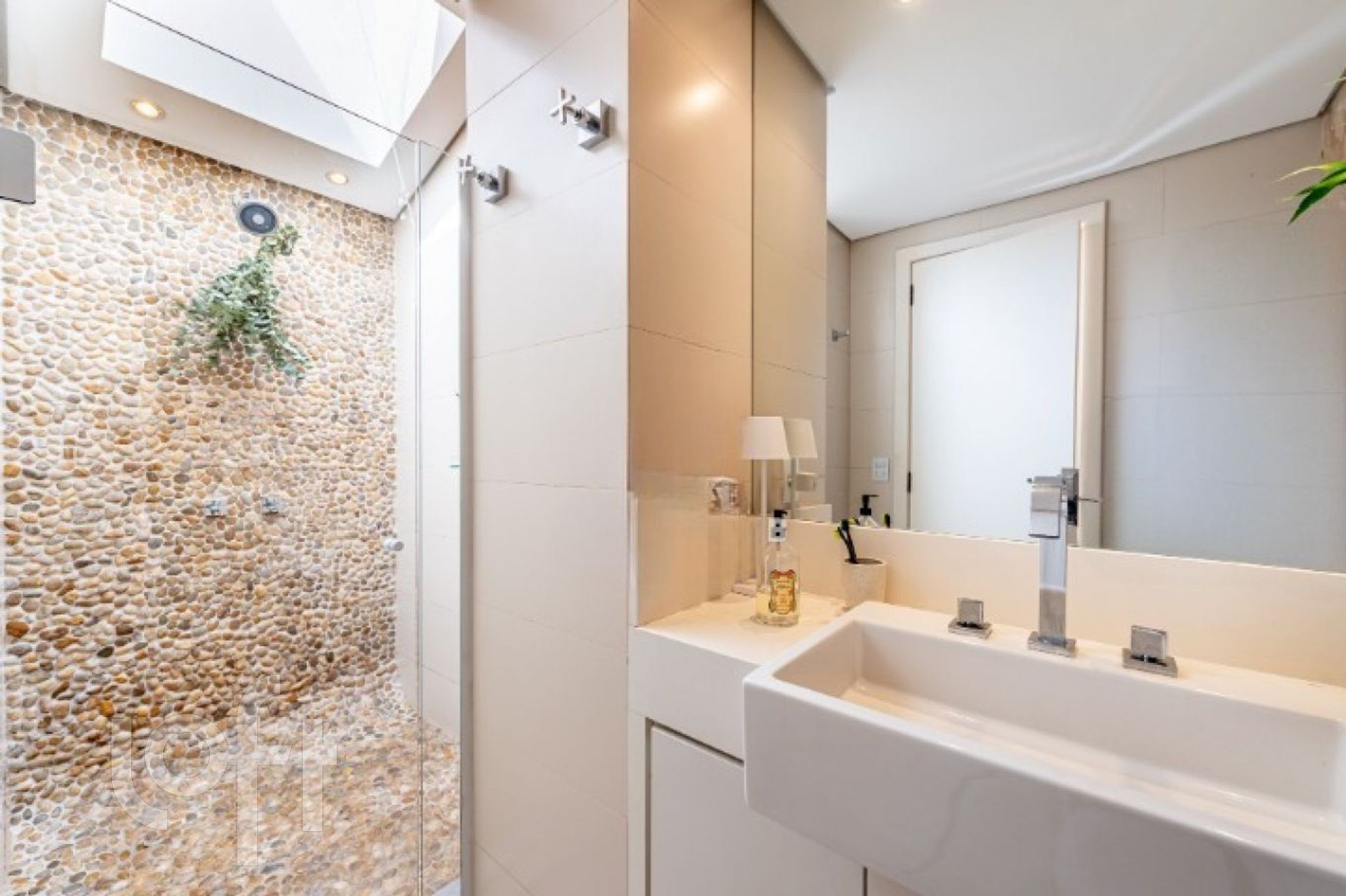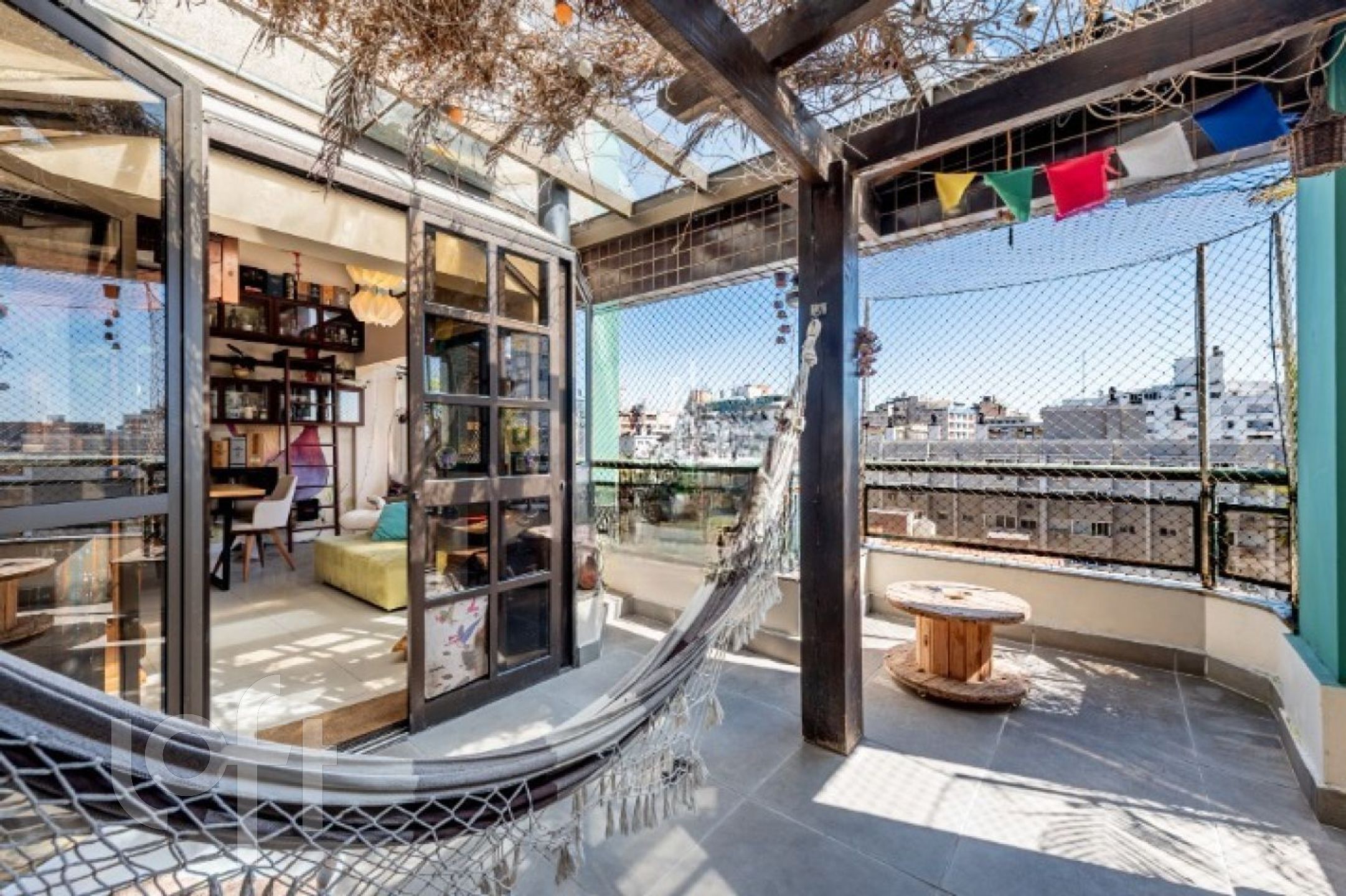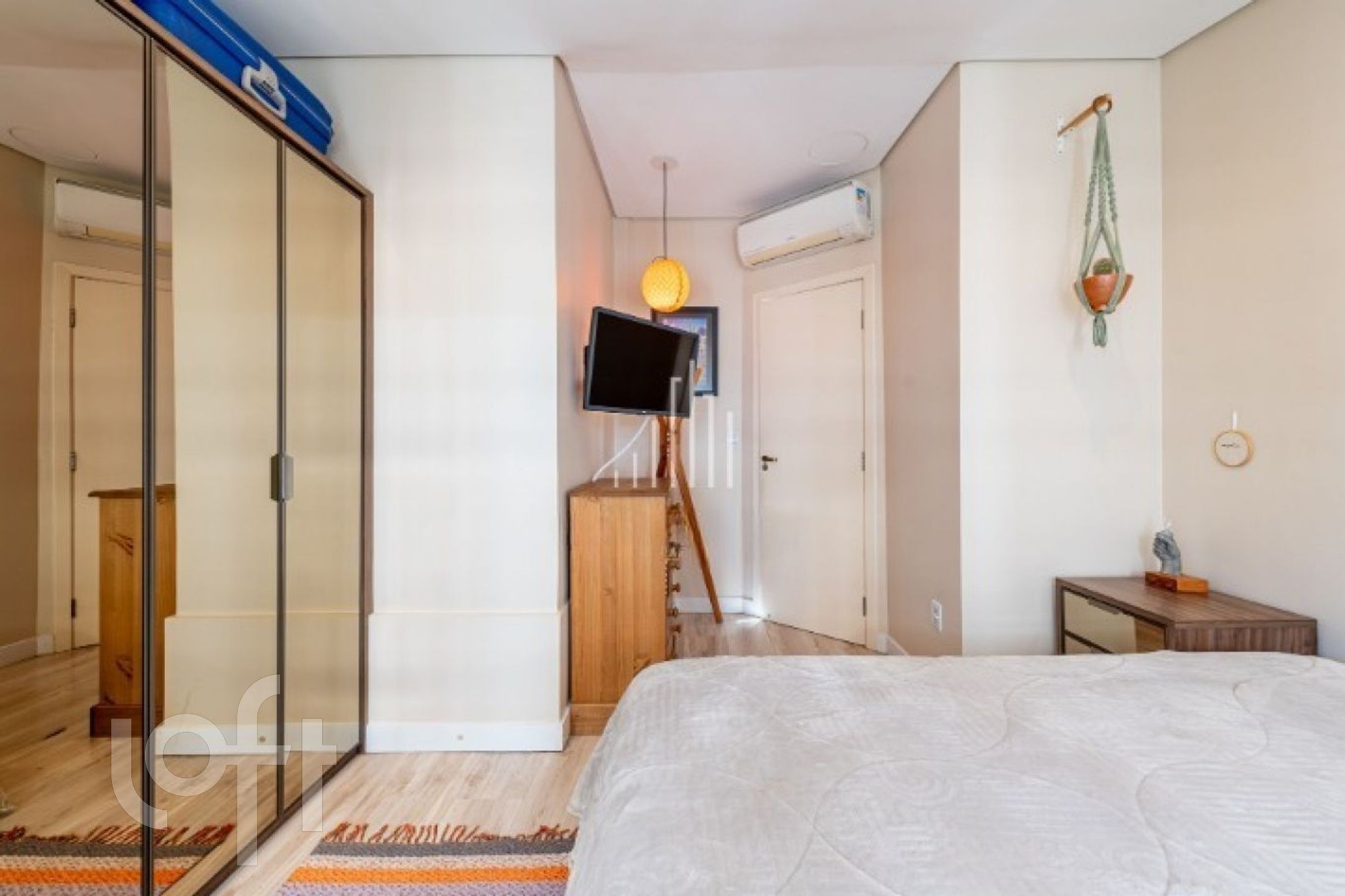 No segundo pavimento, o ambiente íntimo oferece uma sala de estar/TV também com pé-direito duplo, dois dormitórios e banheiro social com claraboia de vidro e abertura para ventilação, garantindo luminosidade e conforto.