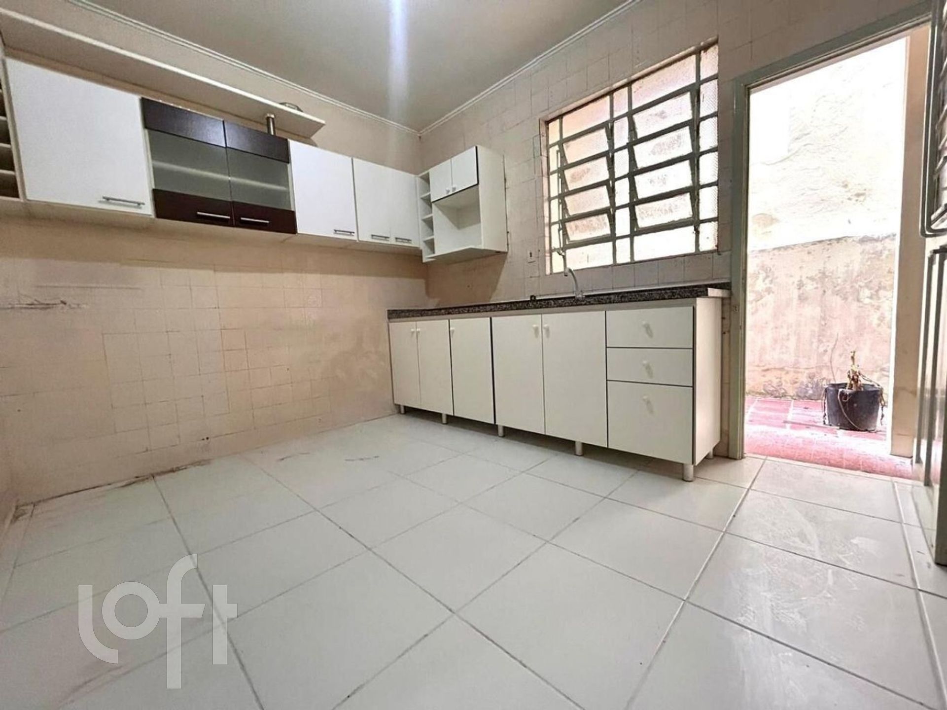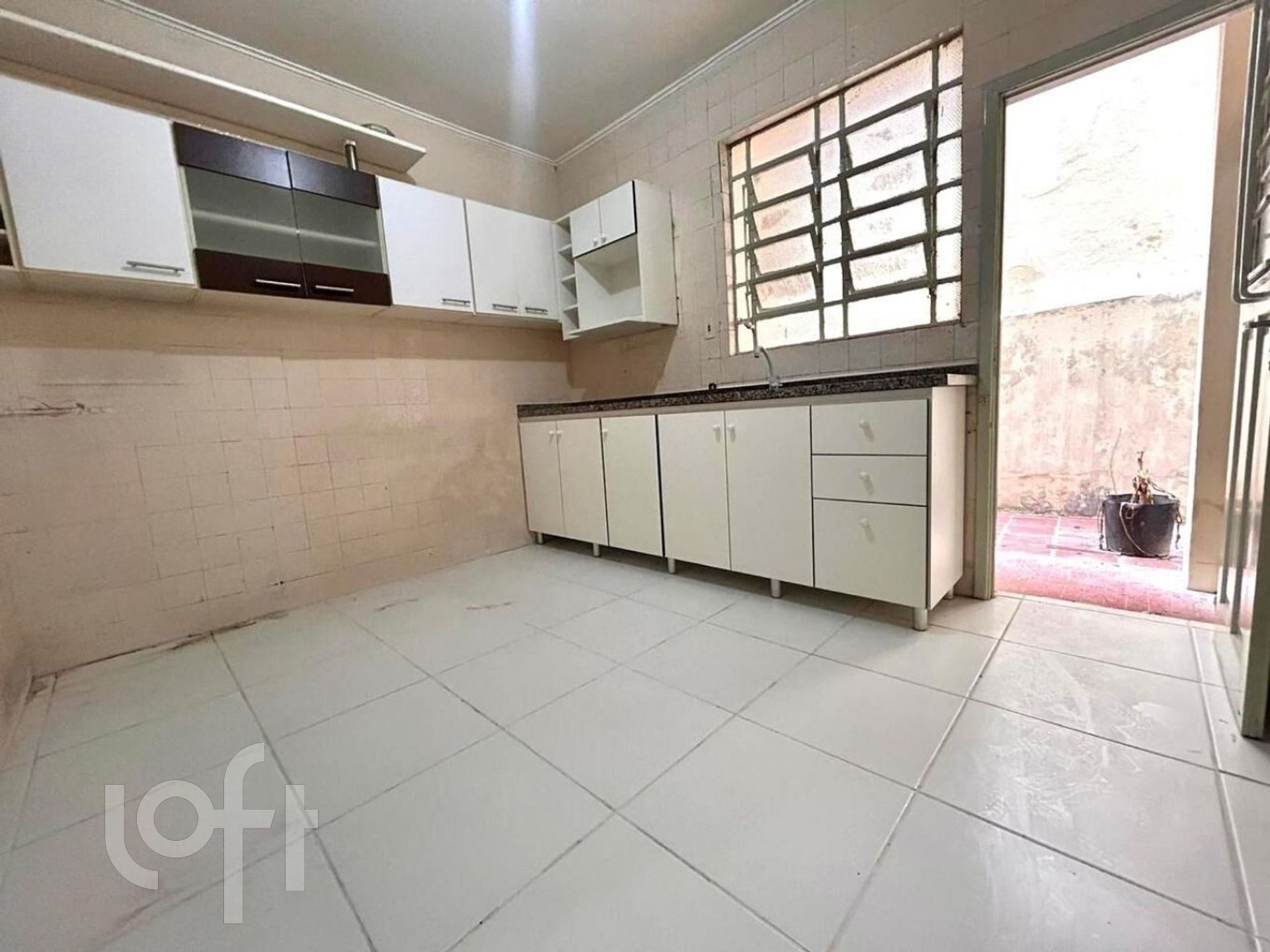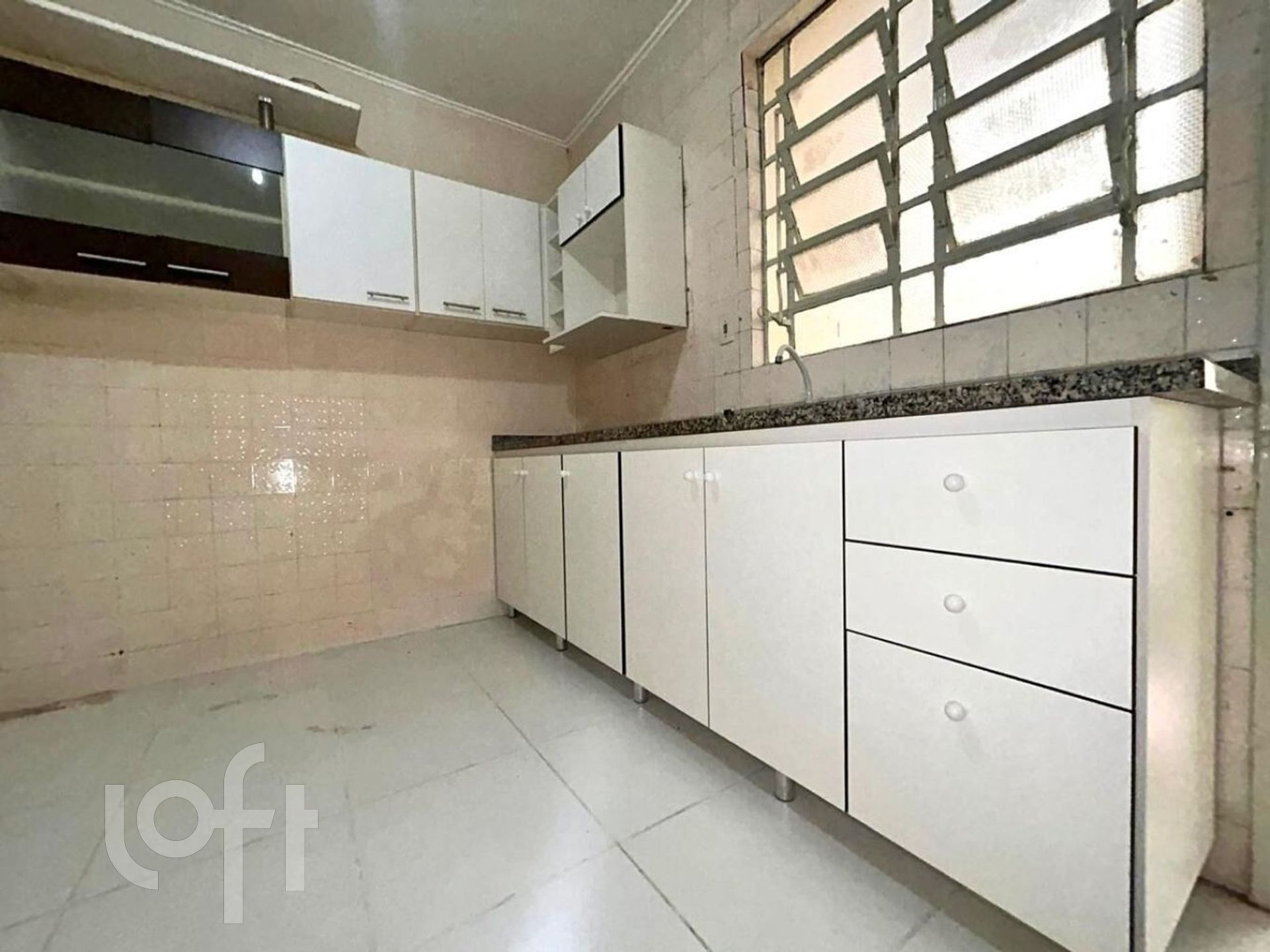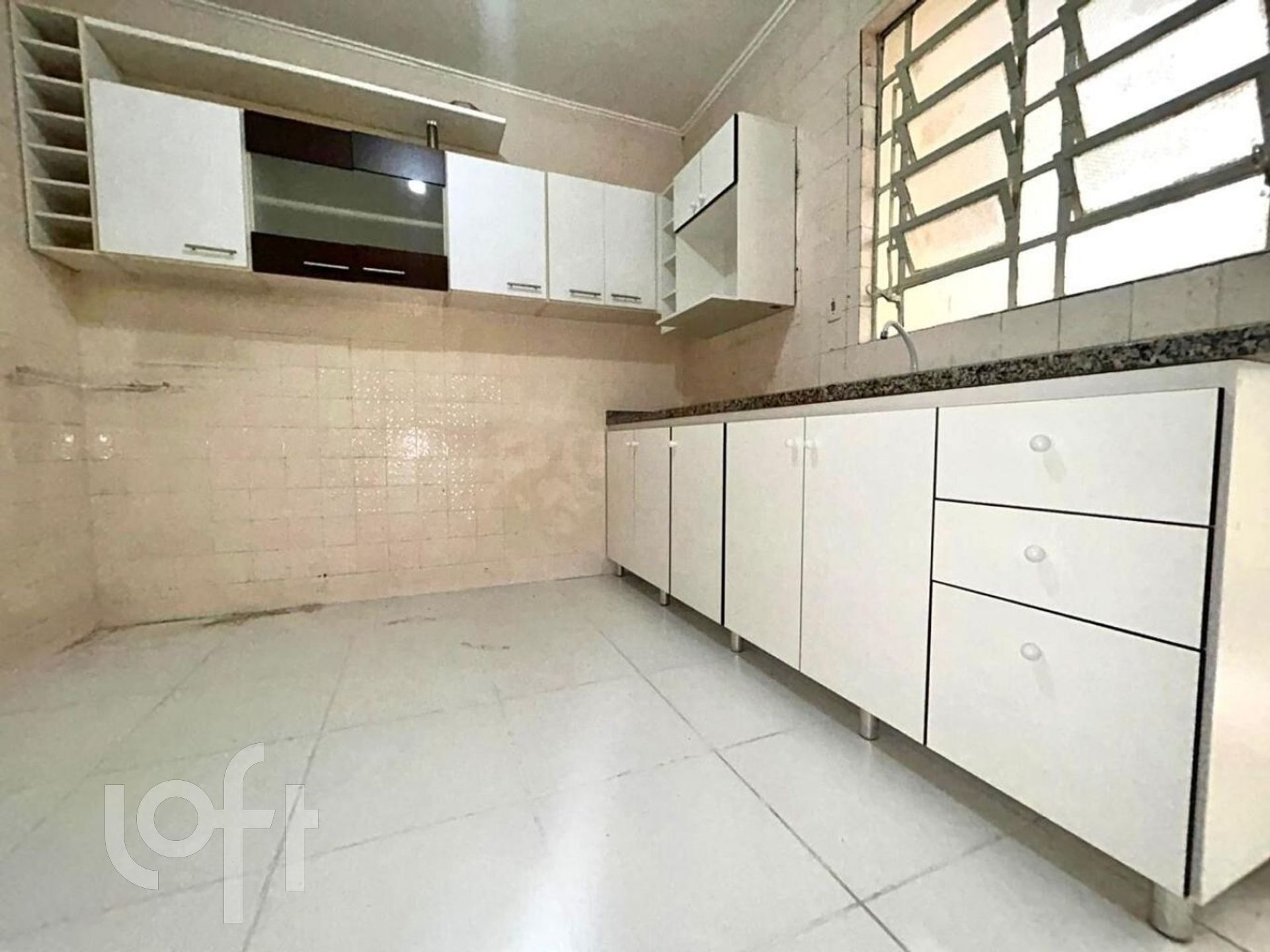 - Cozinha com pia, armários e bancada em mármore;