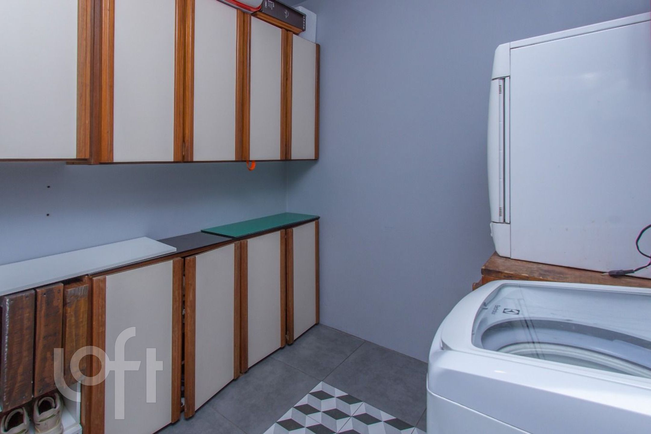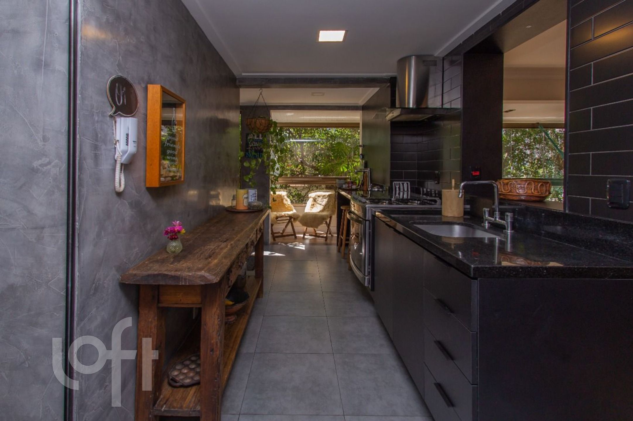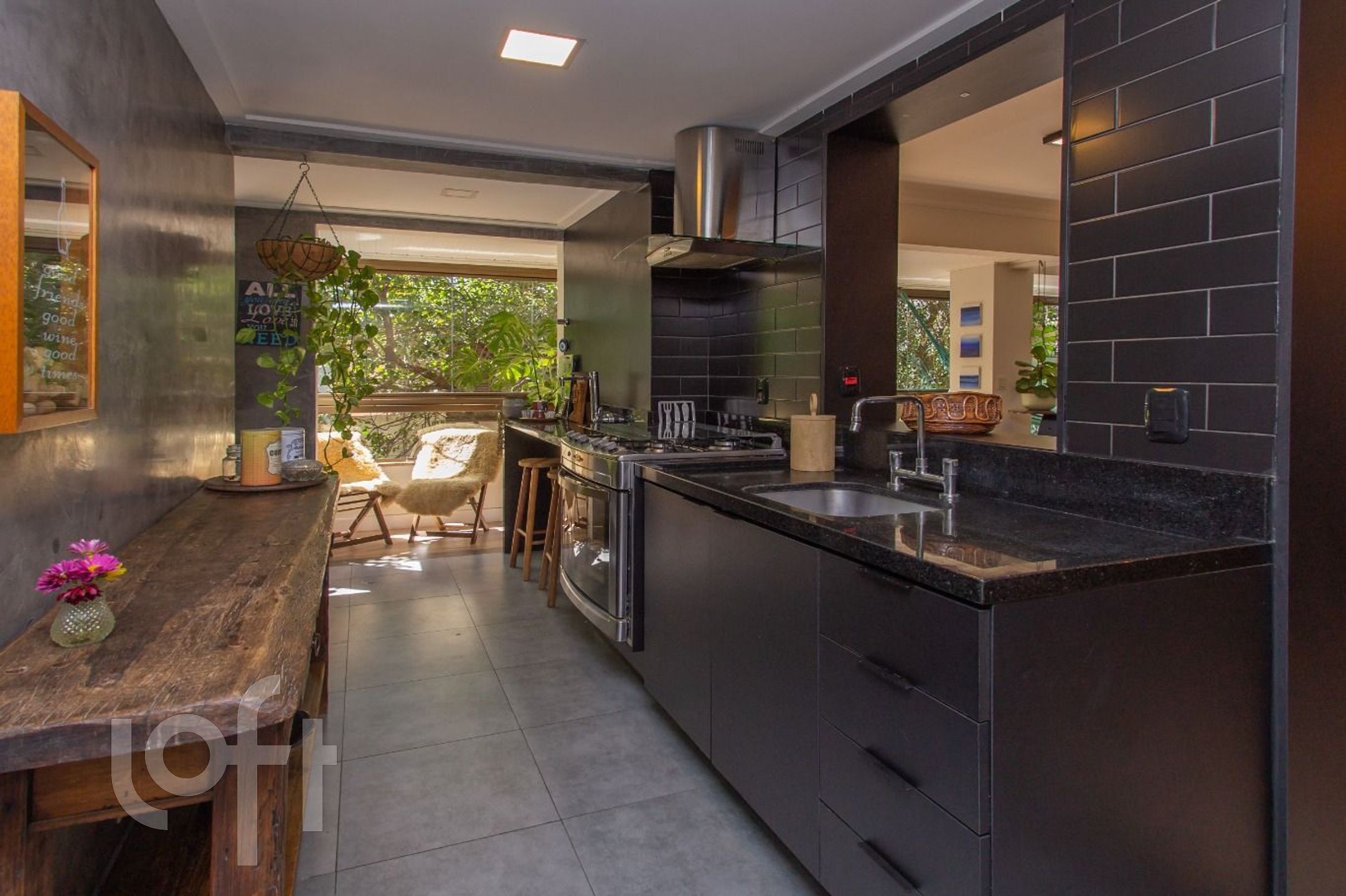 Living com 3 ambientes, com churrasqueira, cozinha americana, dependência transformada em área de serviço, banheiro auxiliar.