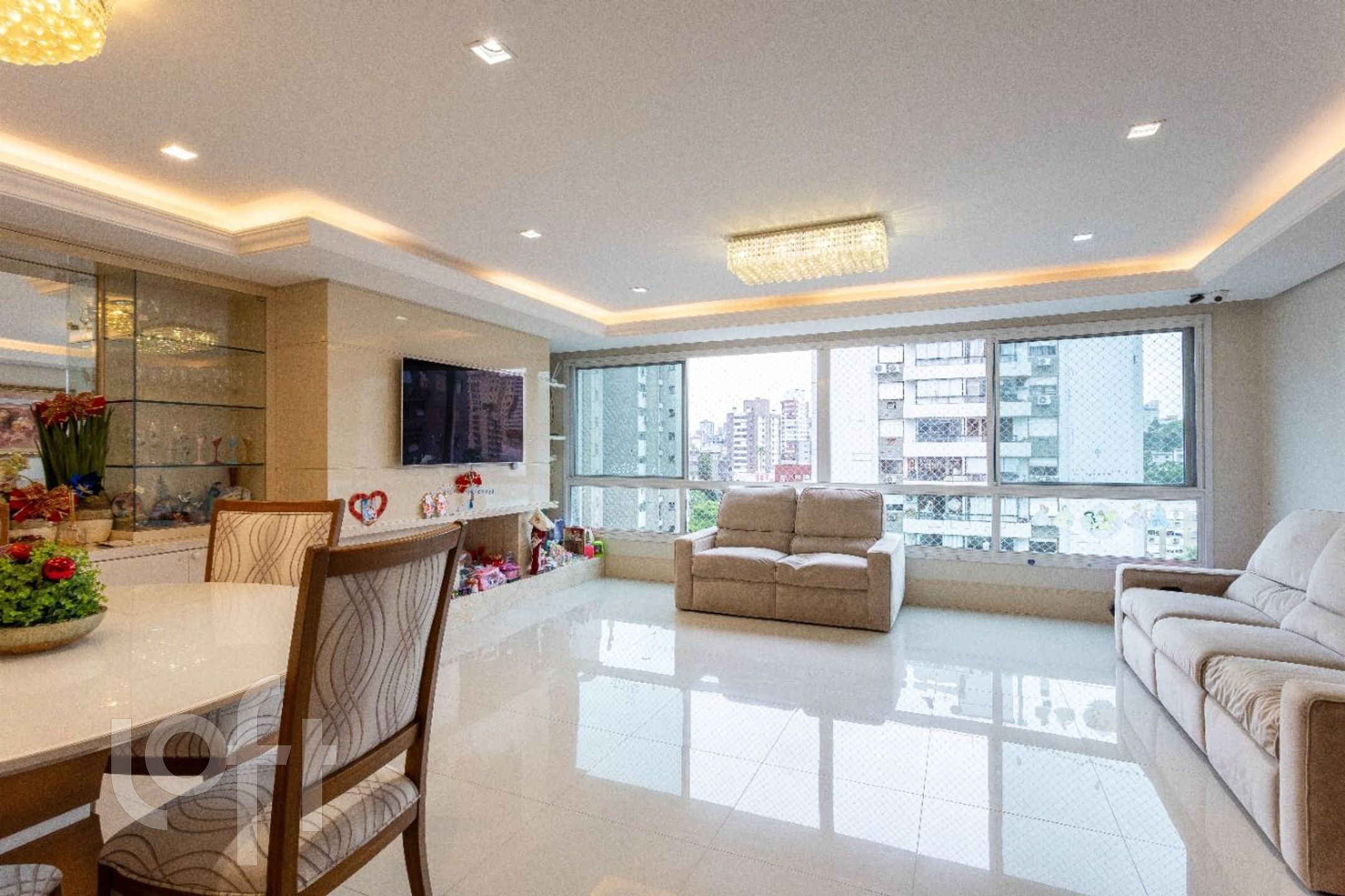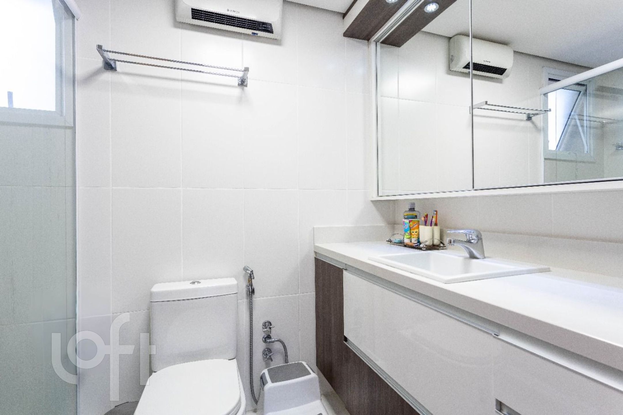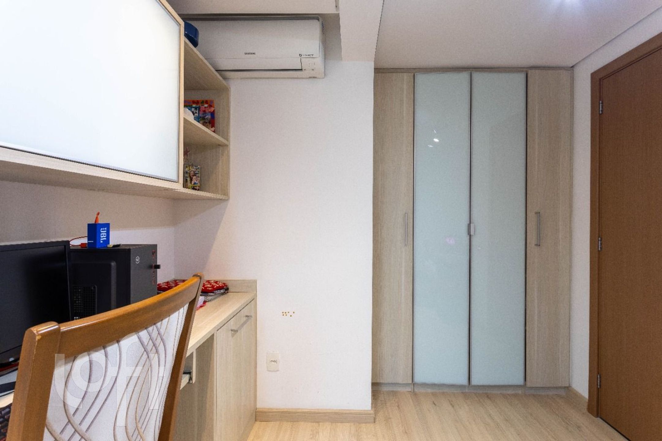 Acabamentos de altíssimo padrão: piso em porcelanato, móveis fixos sob medida e ar-condicionado na sala e em todos os quartos. Vaga dupla com depósito, mais uma vaga individual, totalizando 3 vagas de garagem.