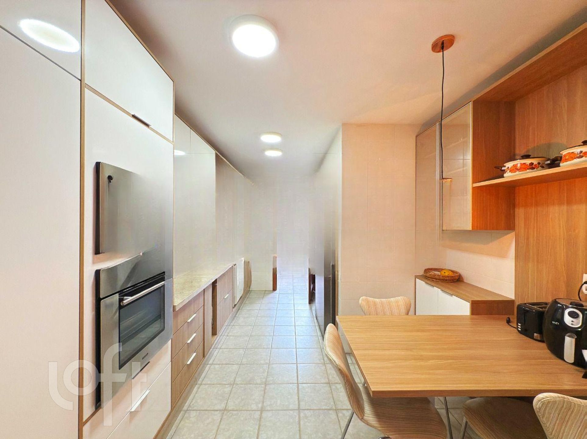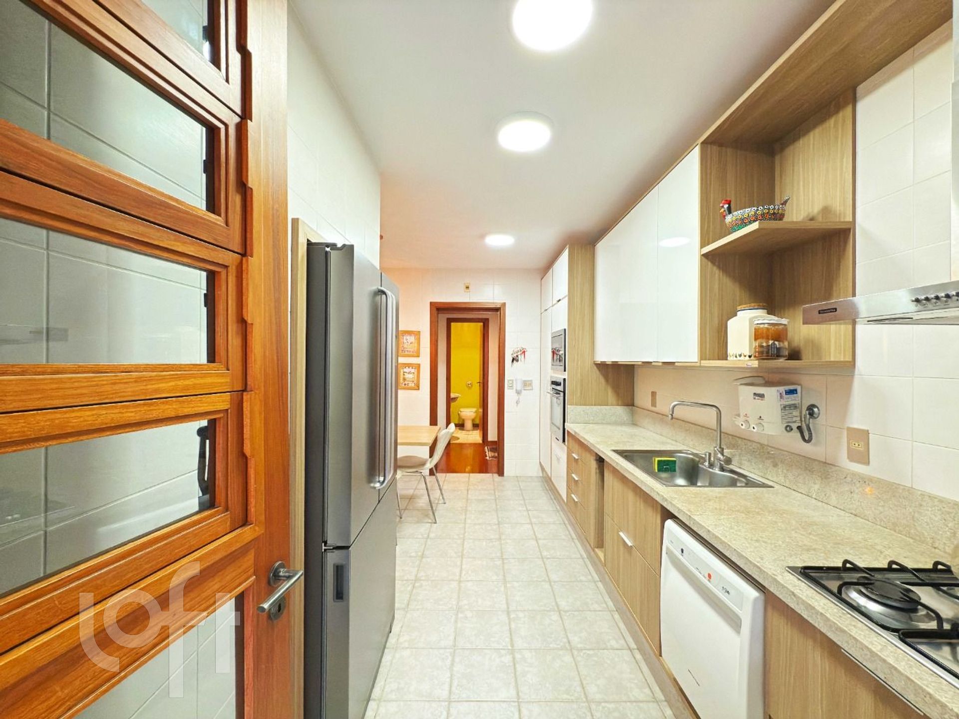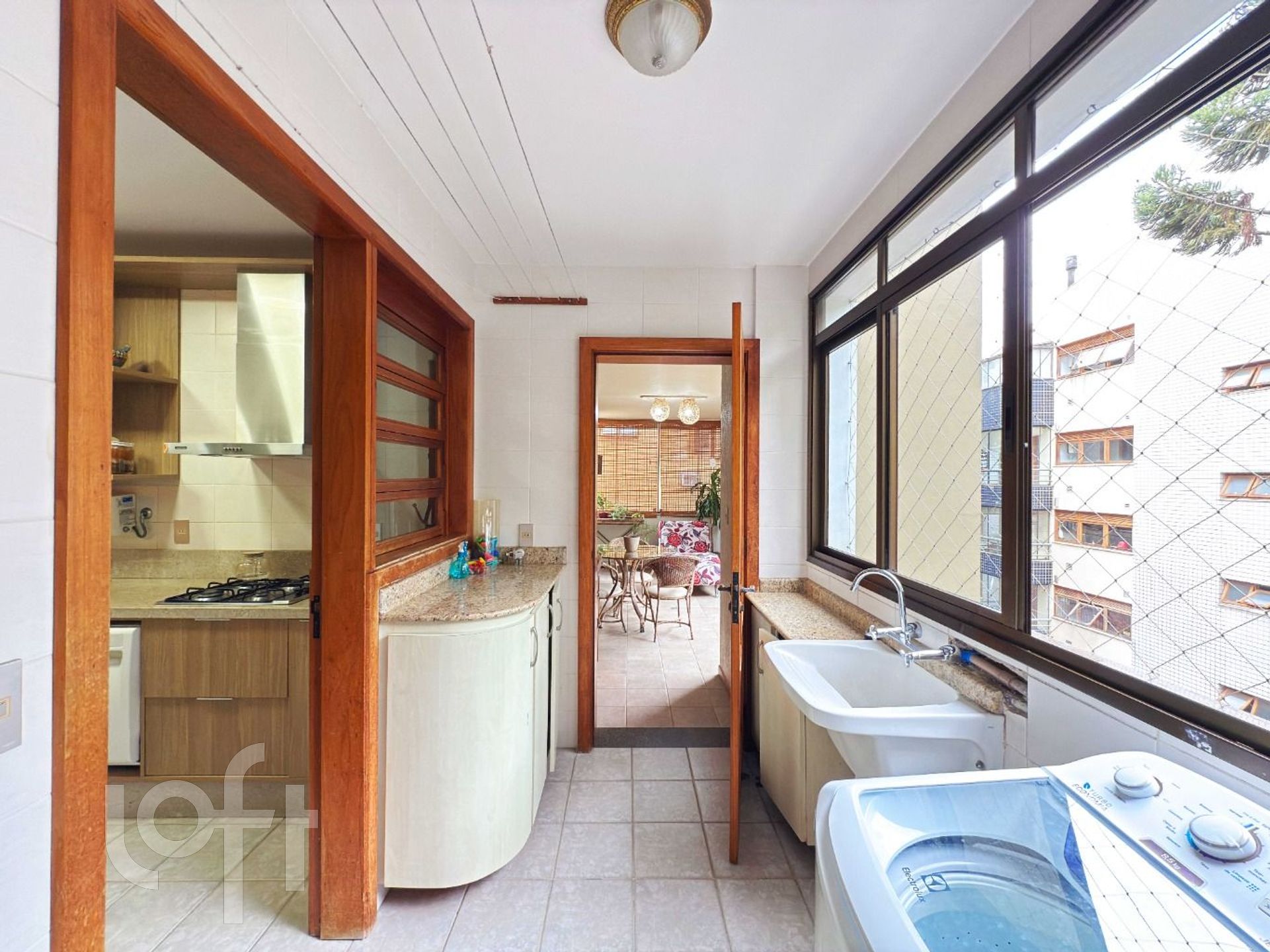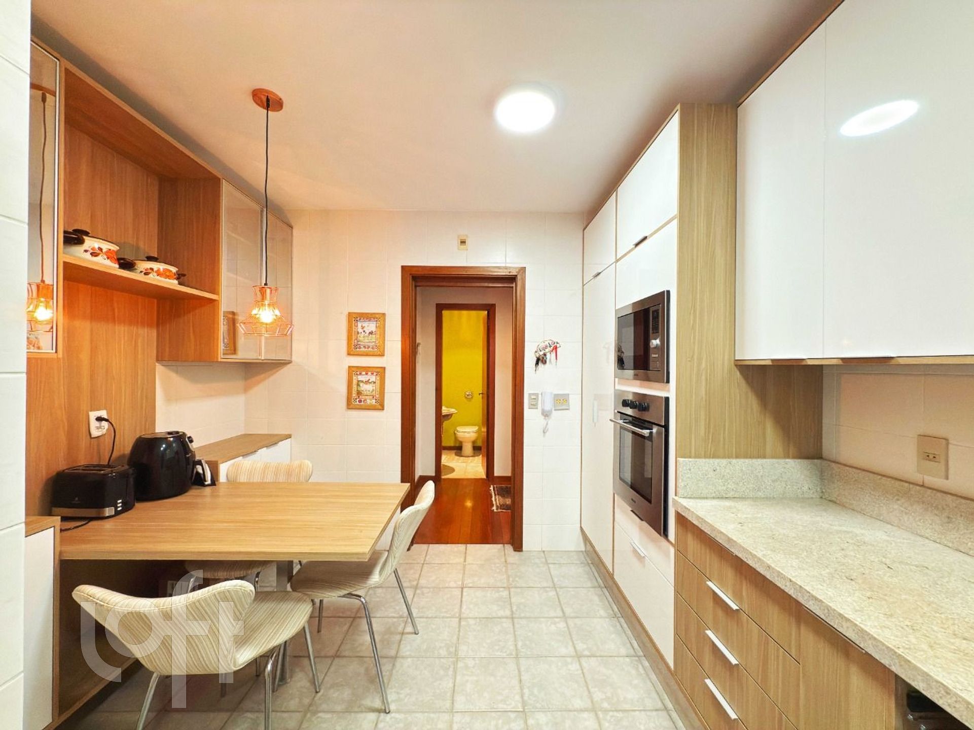 A cozinha tem projeto novo de móveis fixos, é funcional e bem distribuída, conta também com área de serviço separada e ainda com dependência completa de empregada, incluindo banheiro auxiliar.