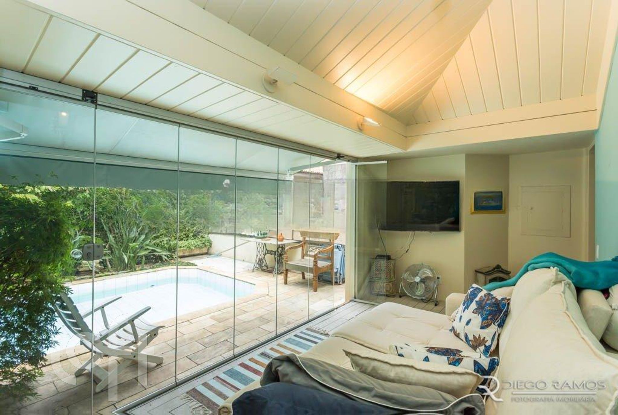 Espaço ao fundo com salão de festas e piscina.