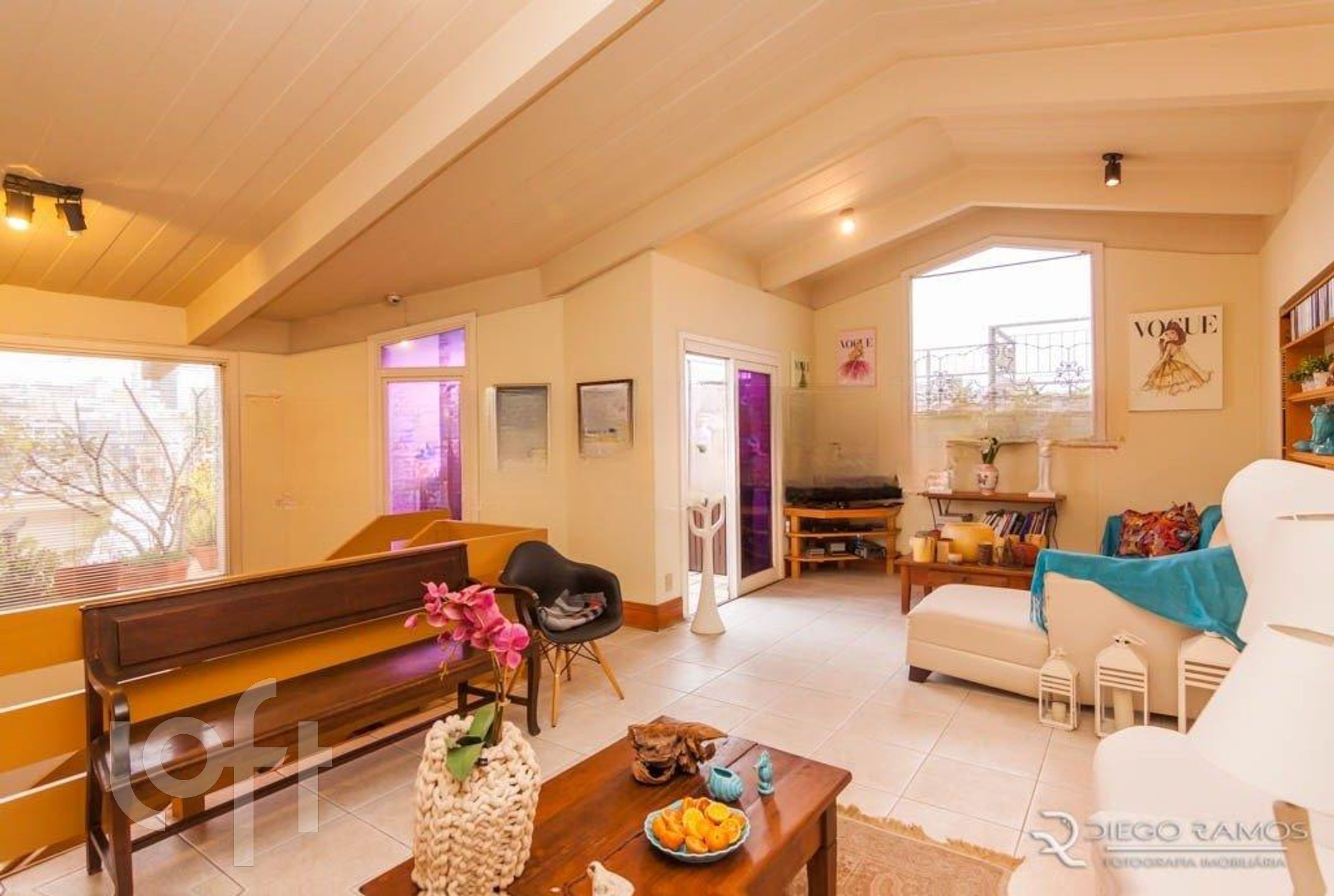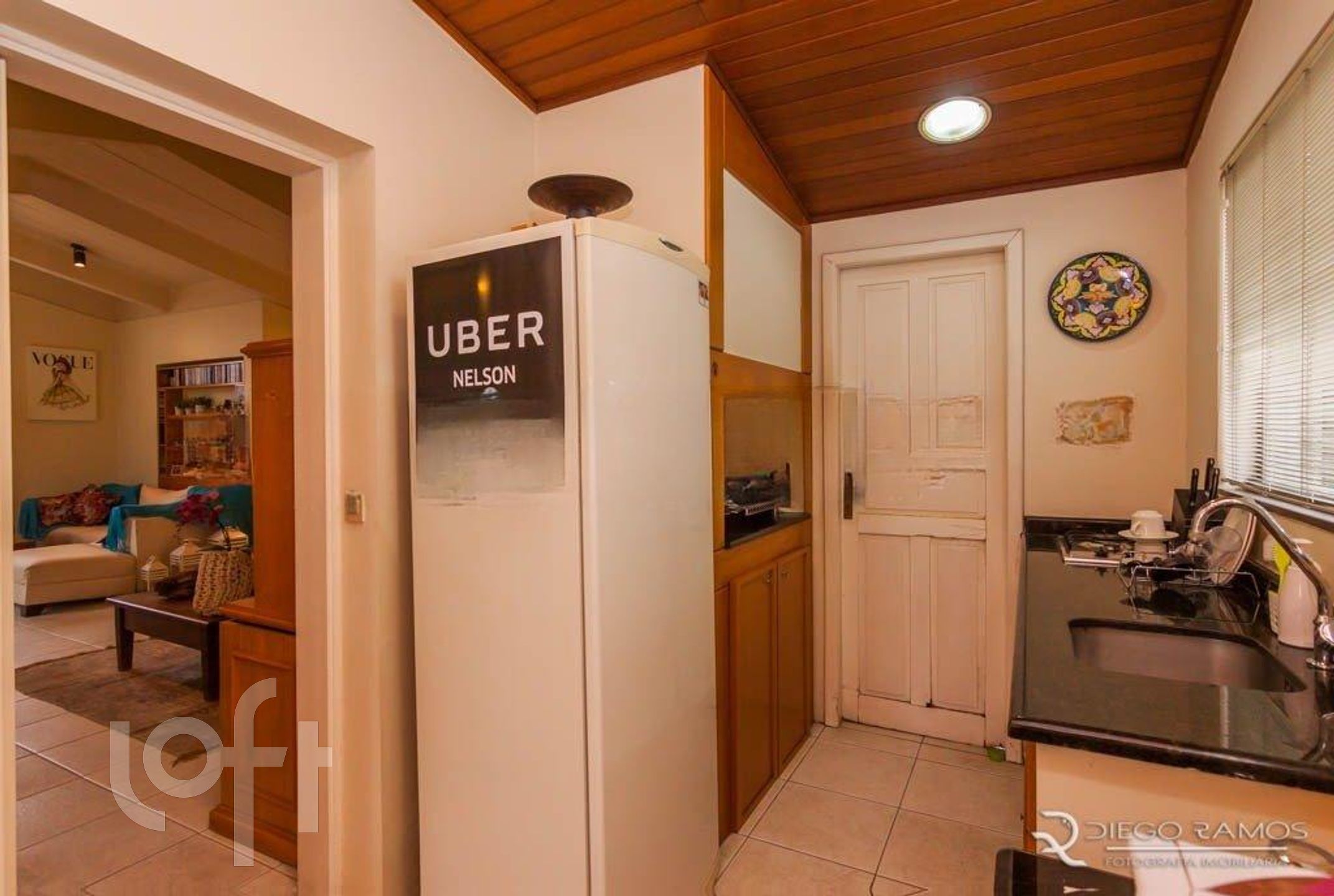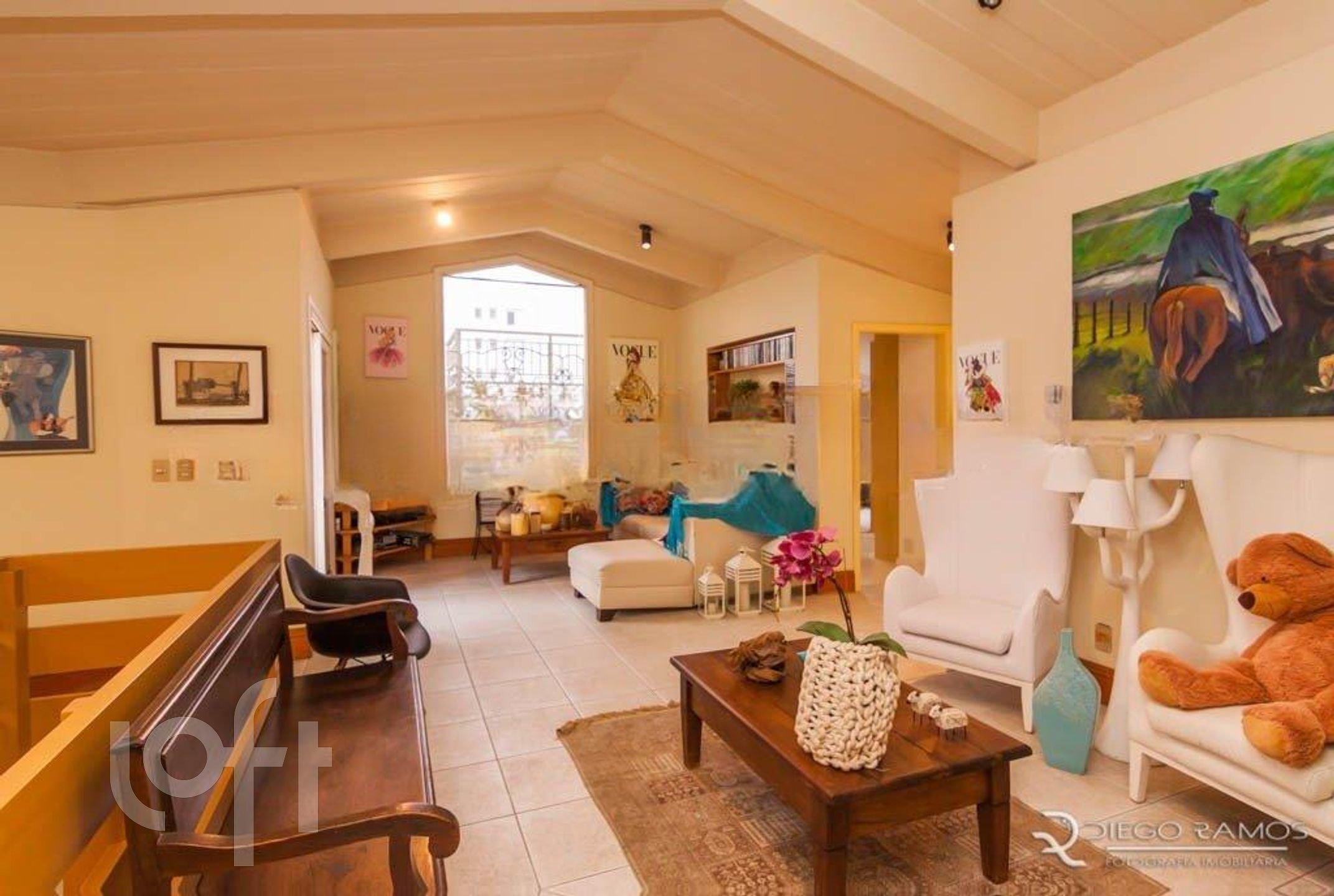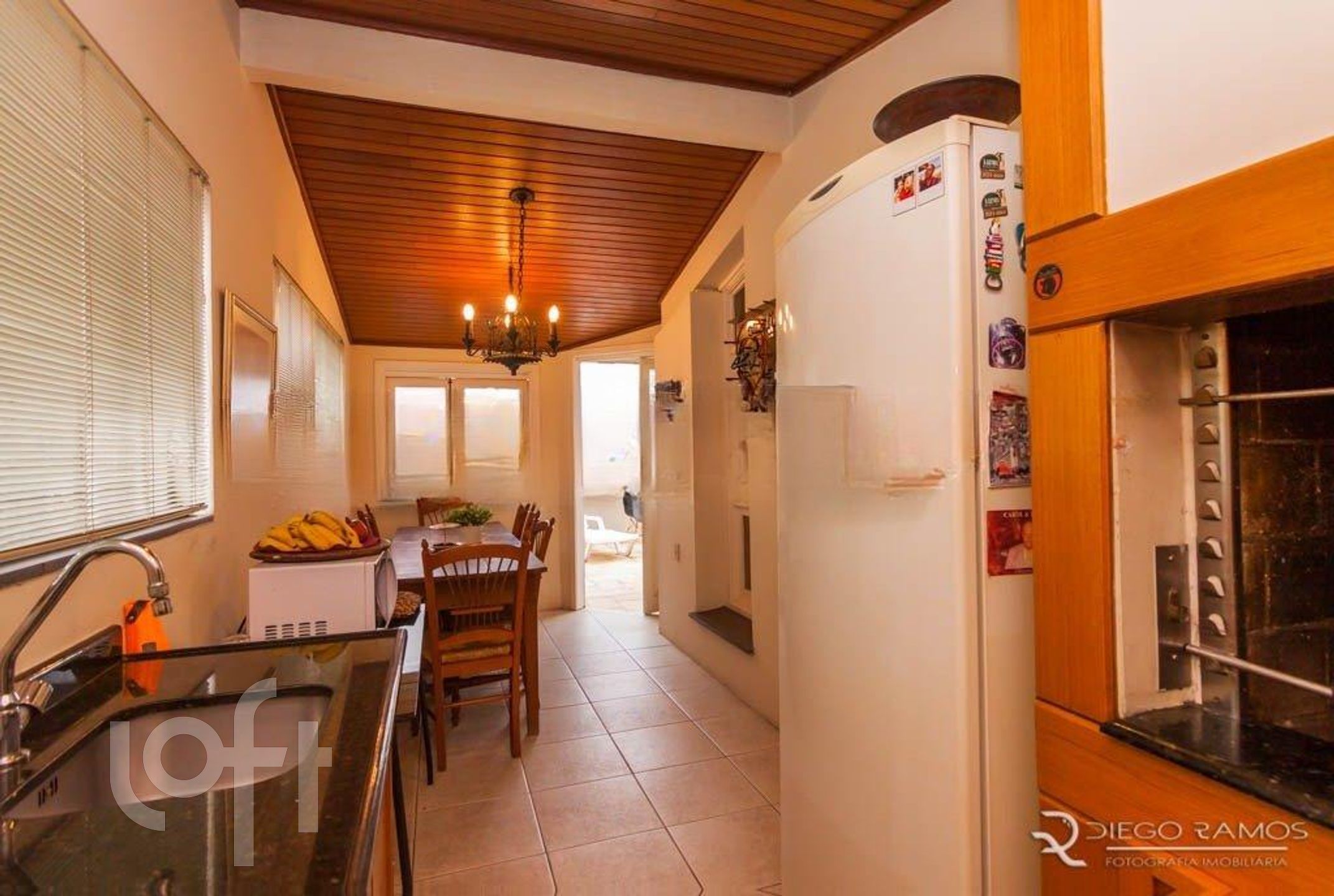 Parte superior espaço gourmet com churrasqueira, living com lareira, mais um dormitório com closet.