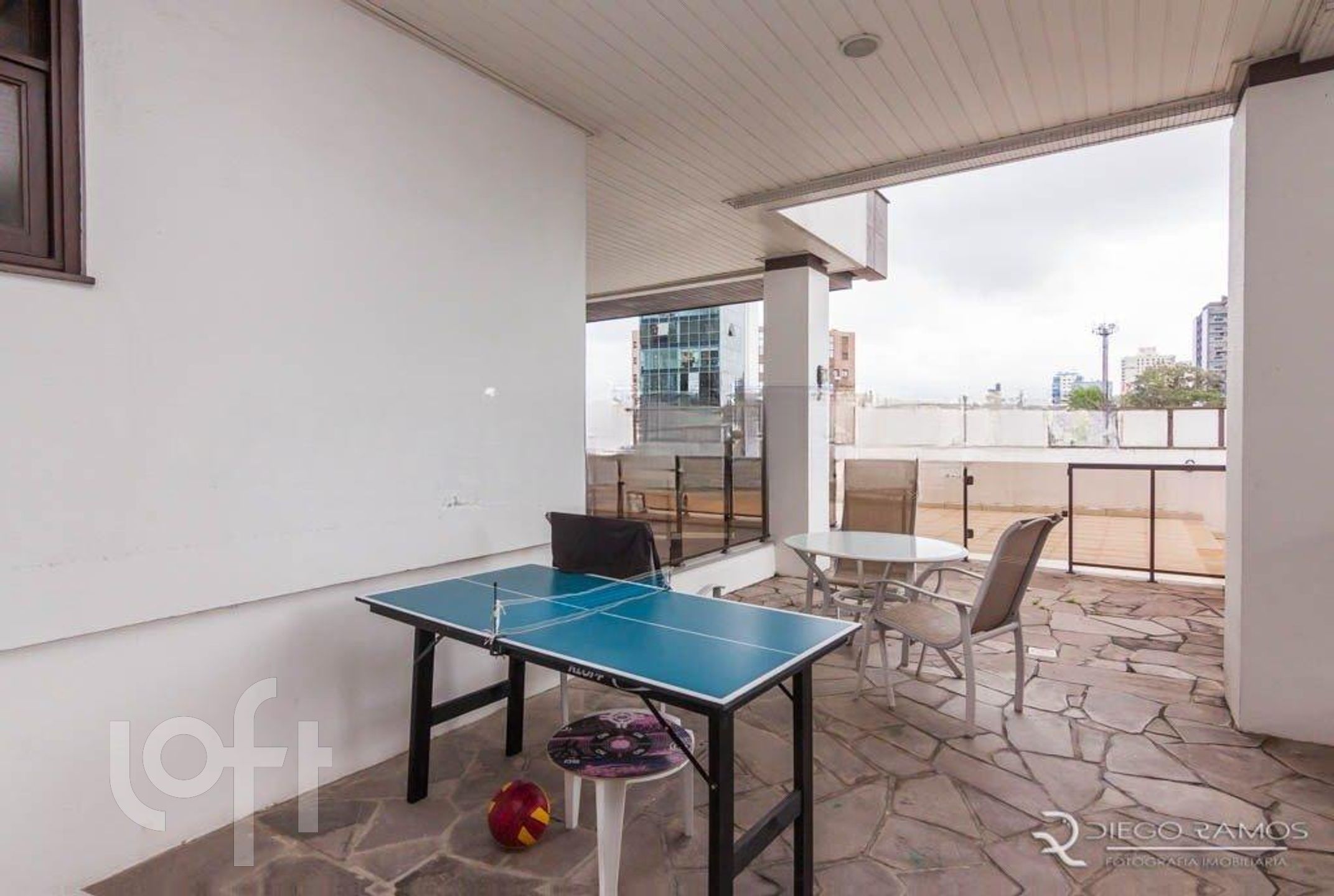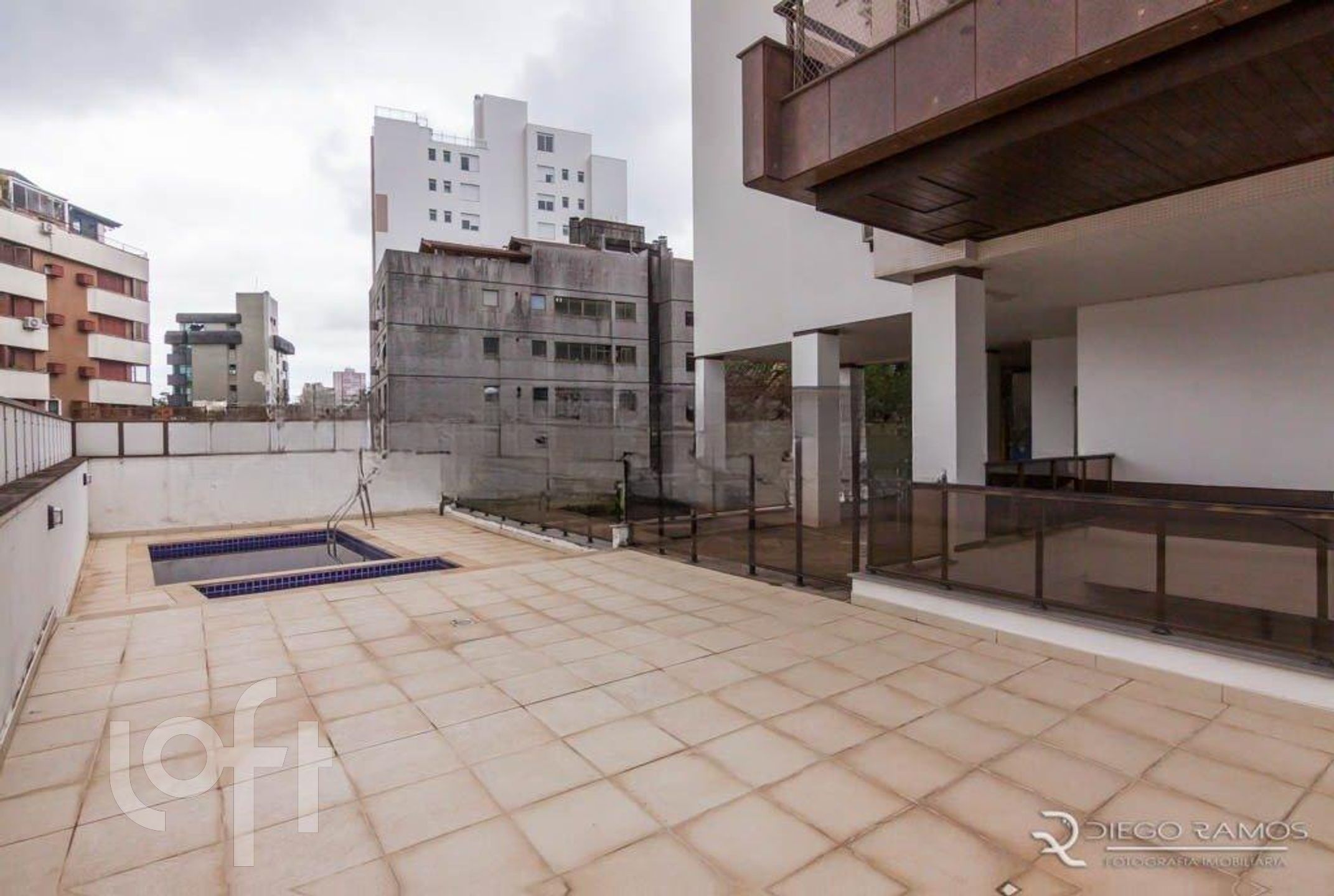 Terraço com piscina e deck. Vista panorâmica.