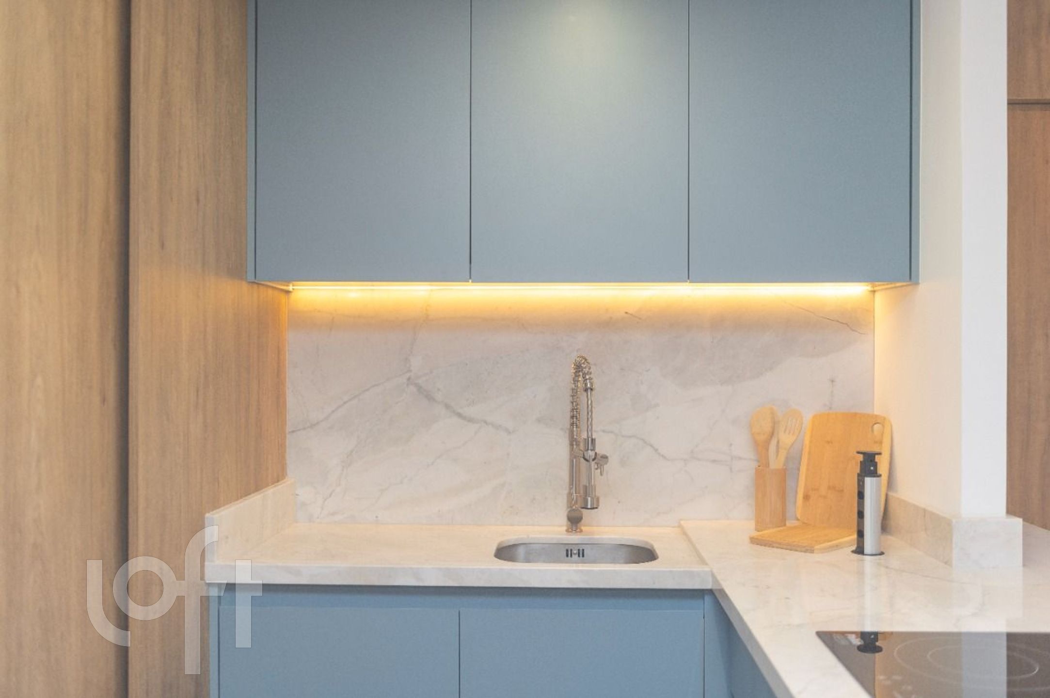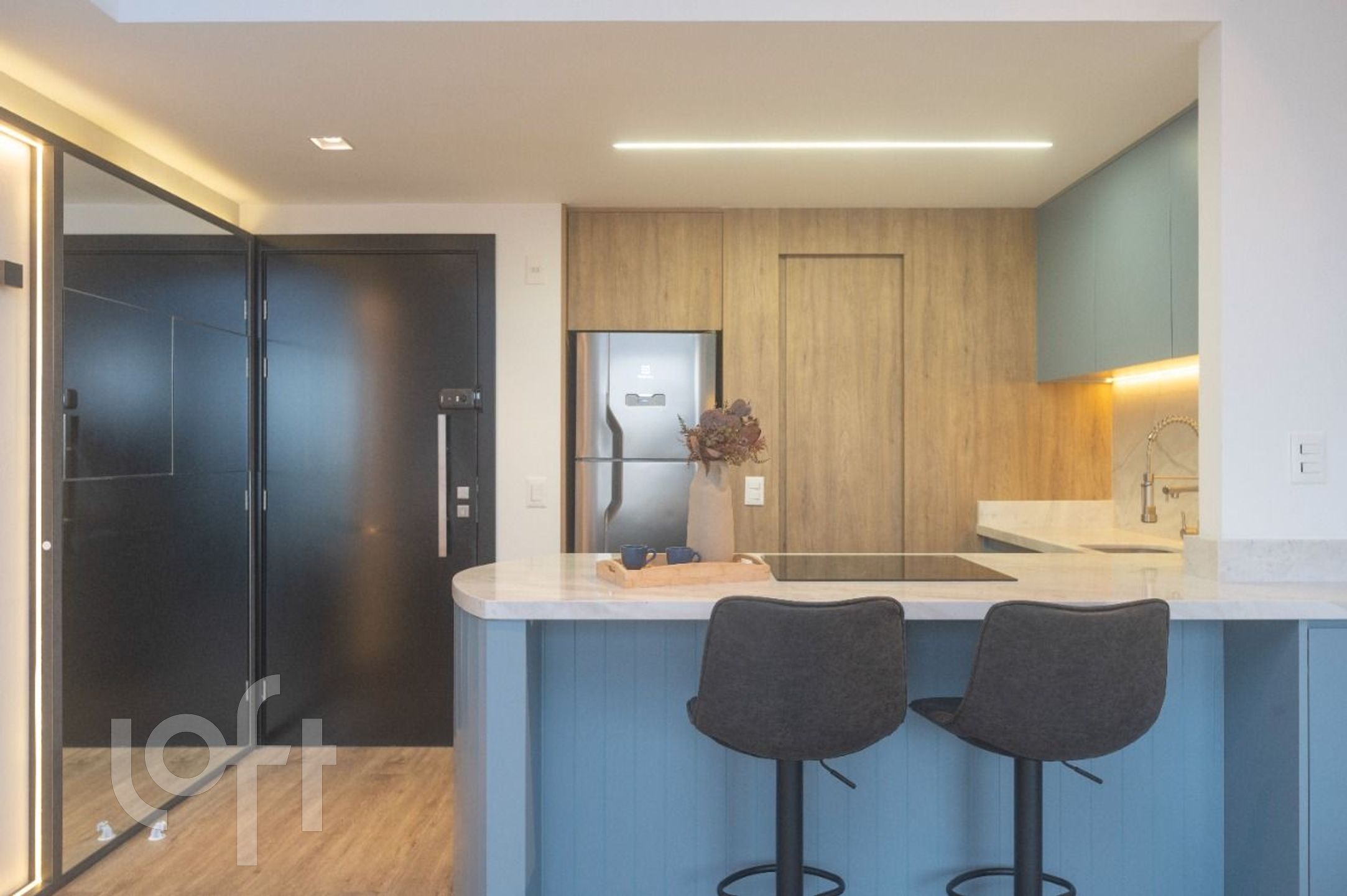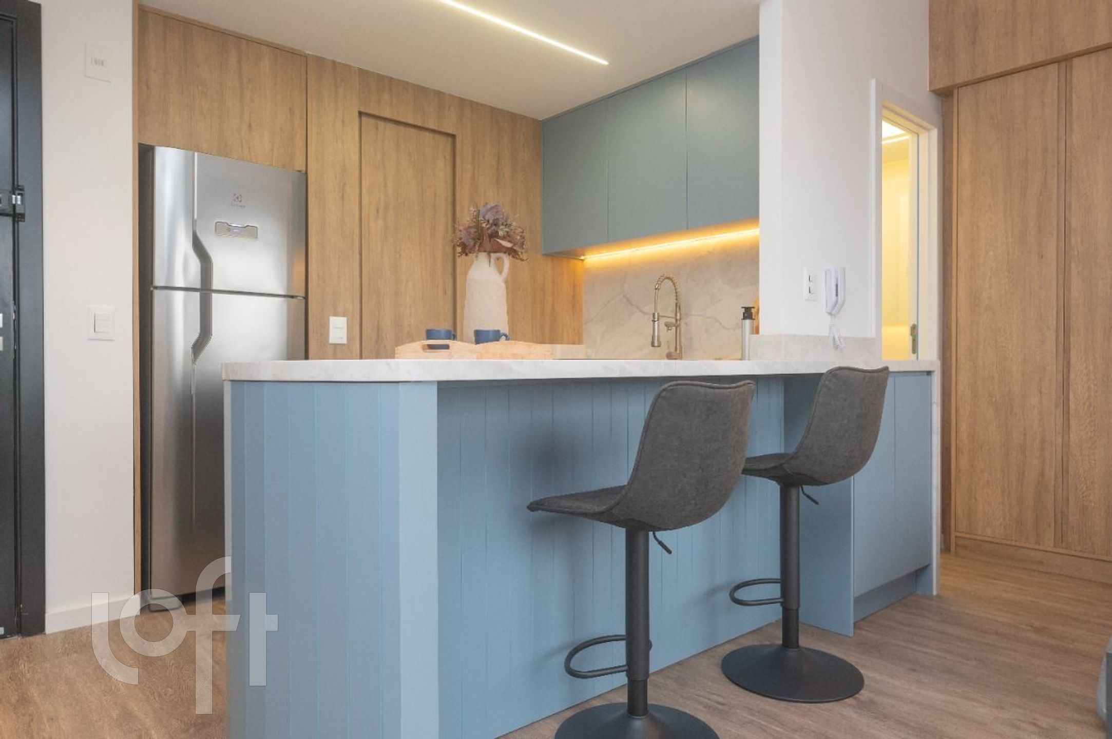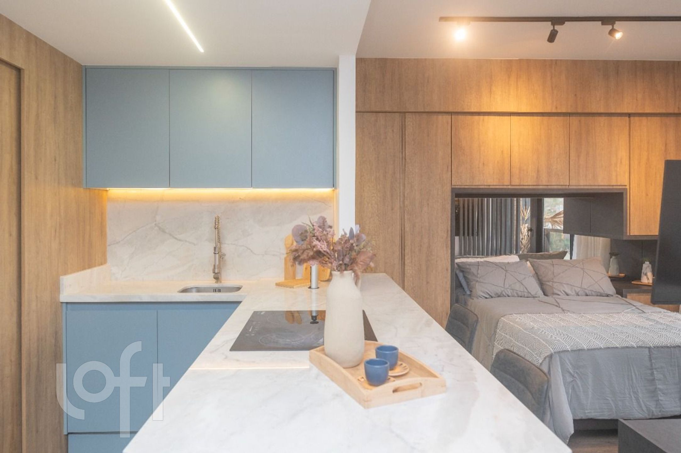 O apartamento conta com uma sacada que proporciona uma vista agradável e uma cozinha funcional.