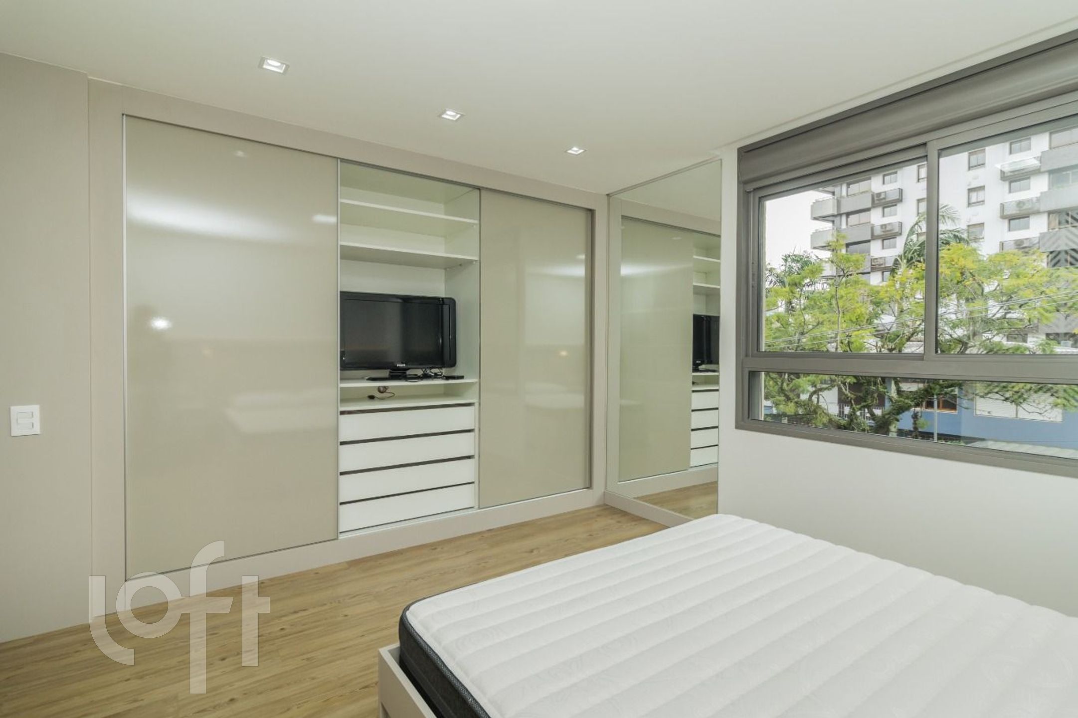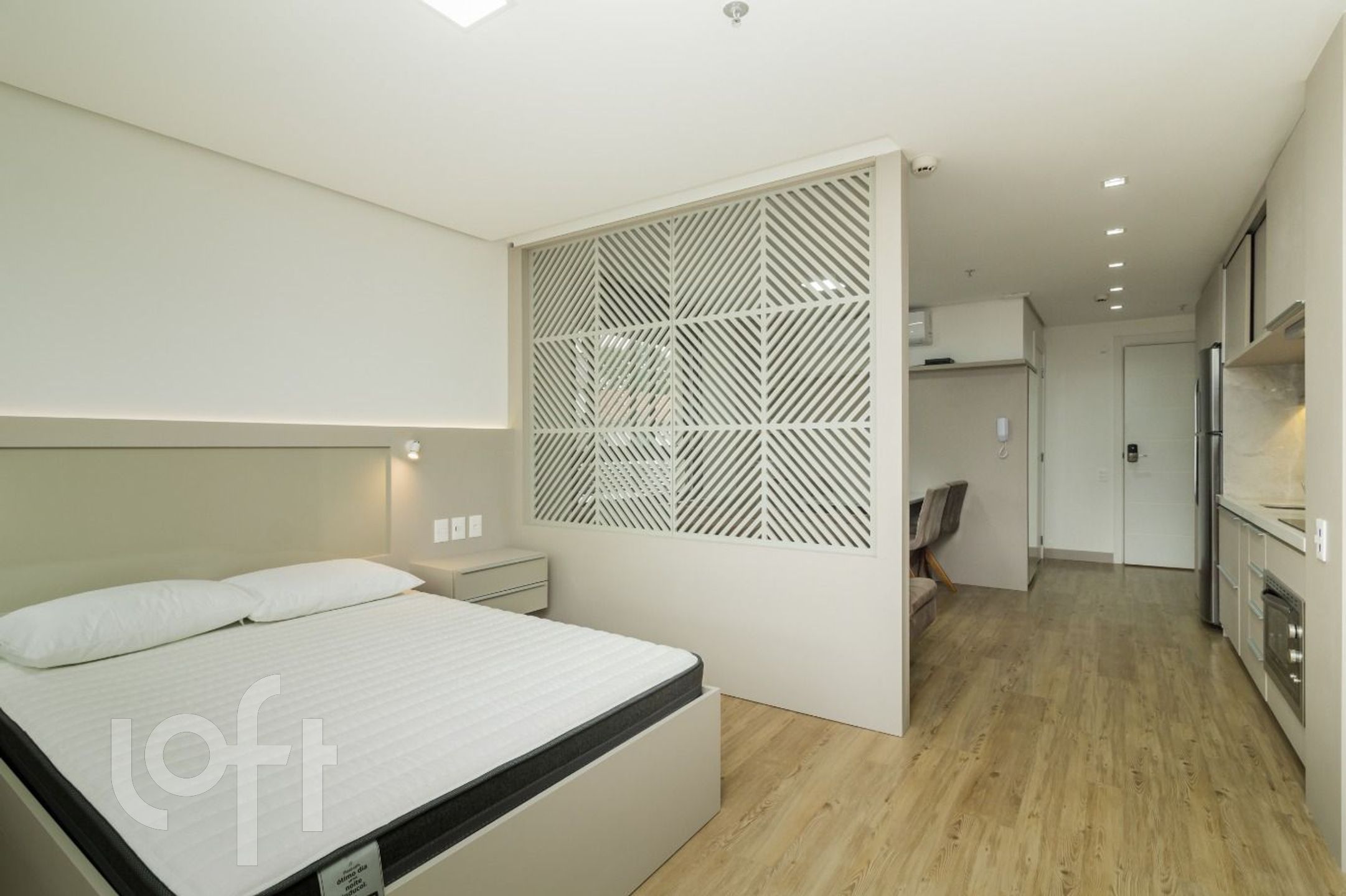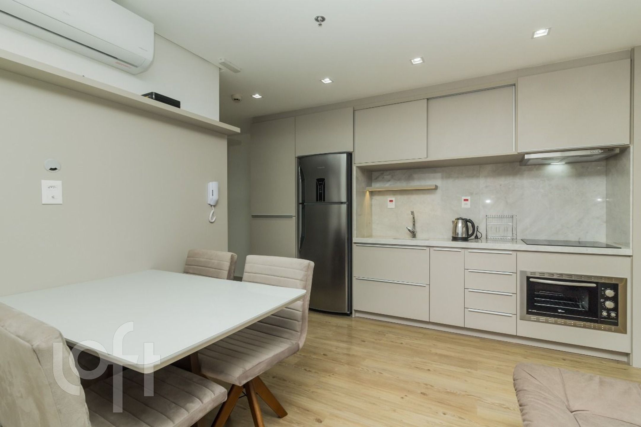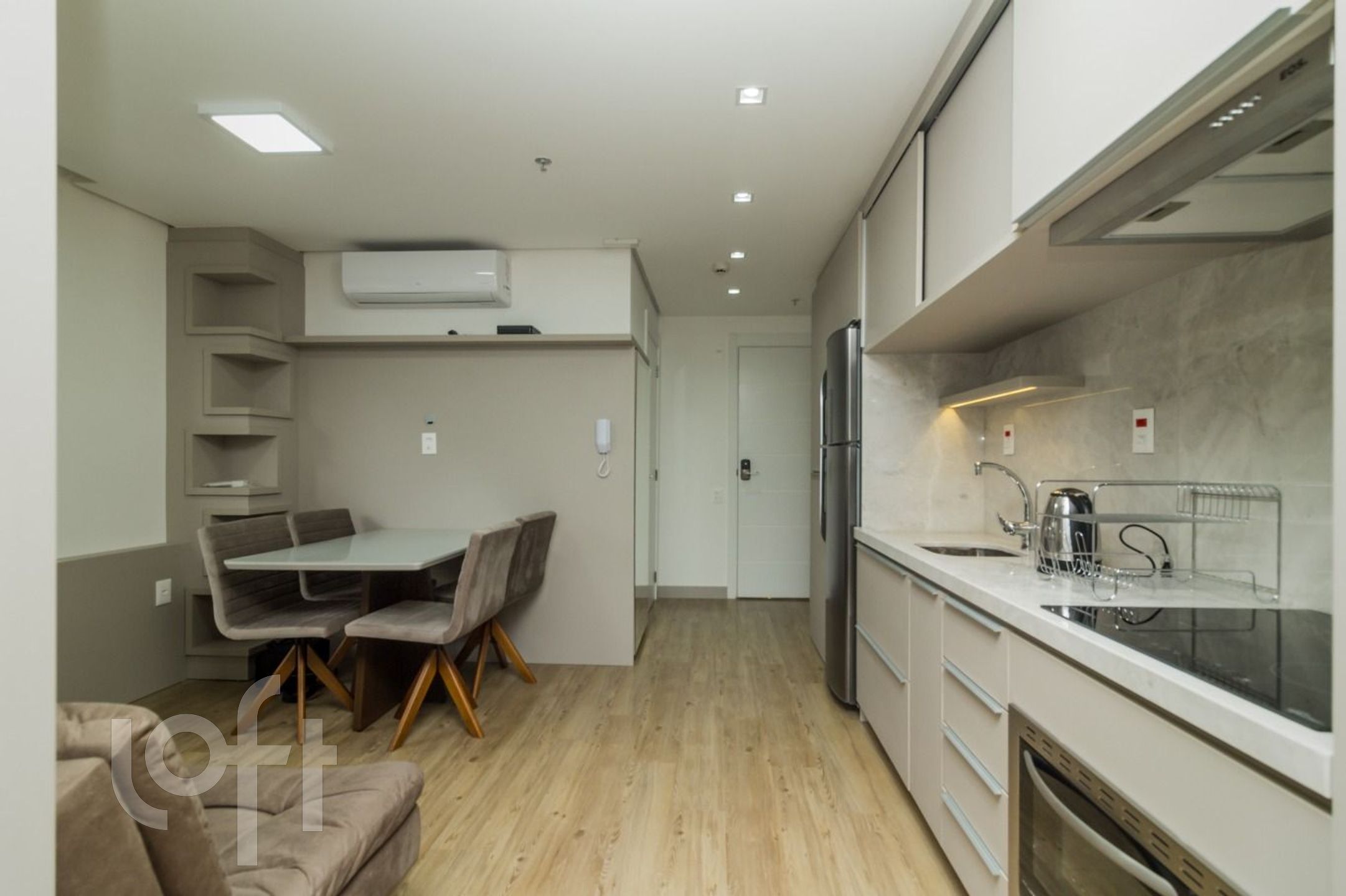 São 42 m de área privativa, onde estão distribuídos: 1 dormitório com armários, TV e cama, living com divisória para o dormitório com armários, sofá, mesa com cadeiras e ar condicionado split, cozinha com pia, armários, cooktop por indução, forno embutido, geladeira, microondas e máquina lava e seca, banheiro social com box e armário.