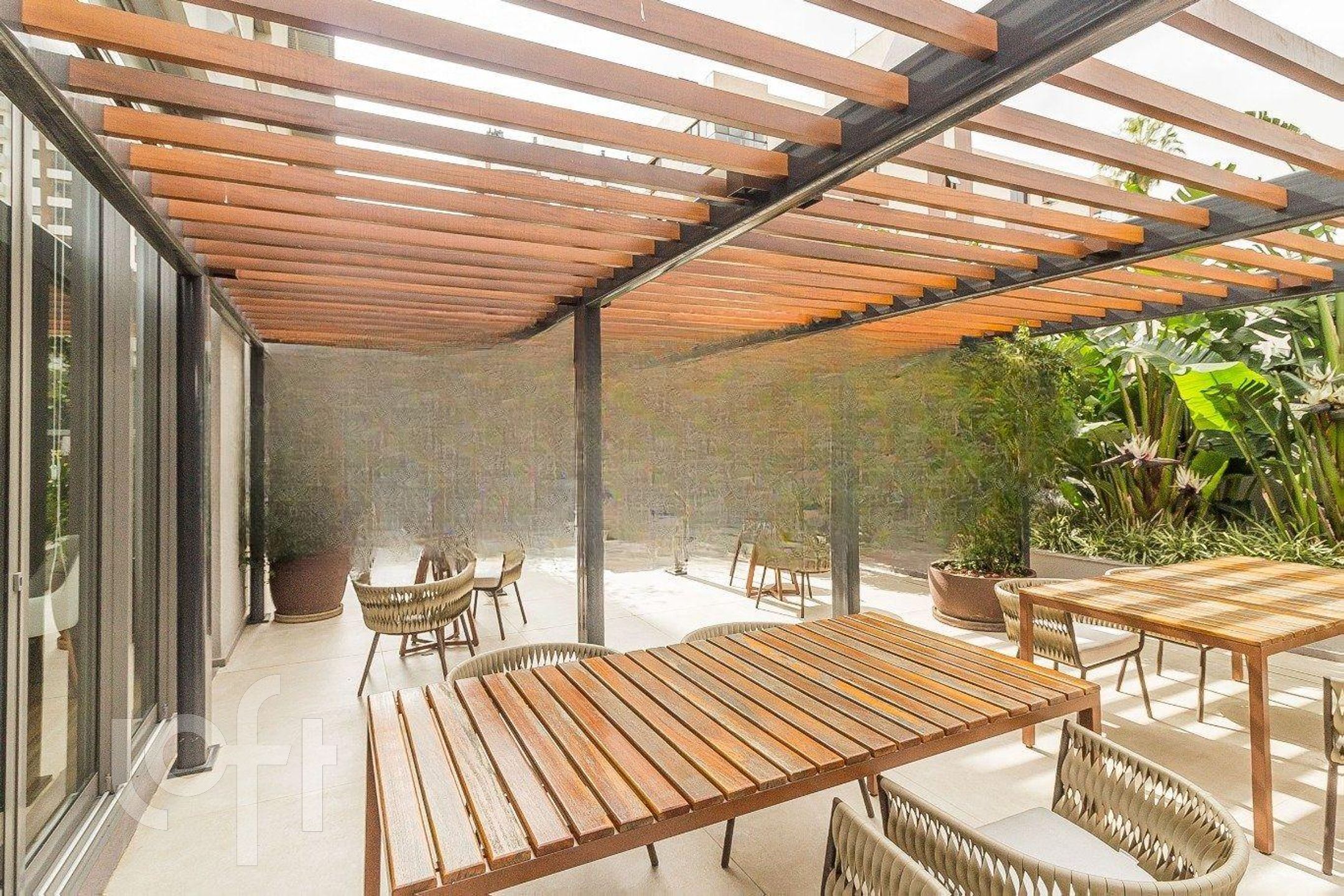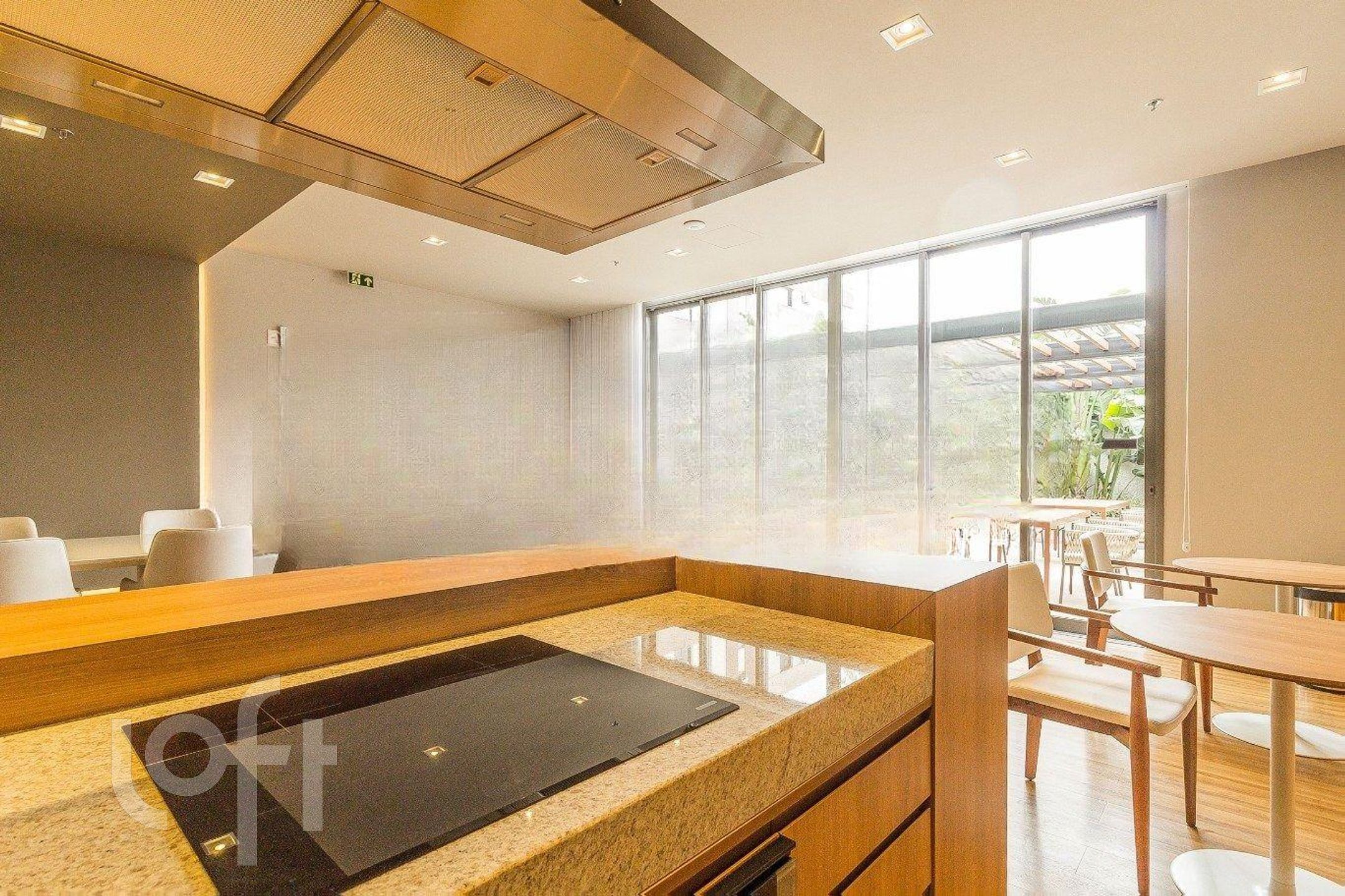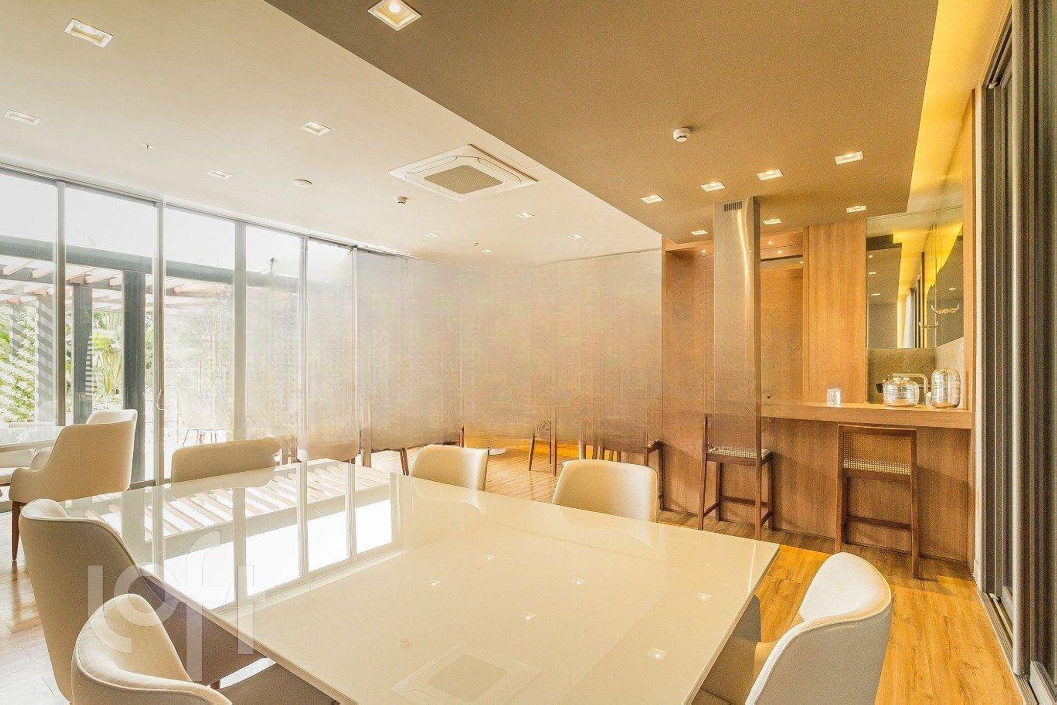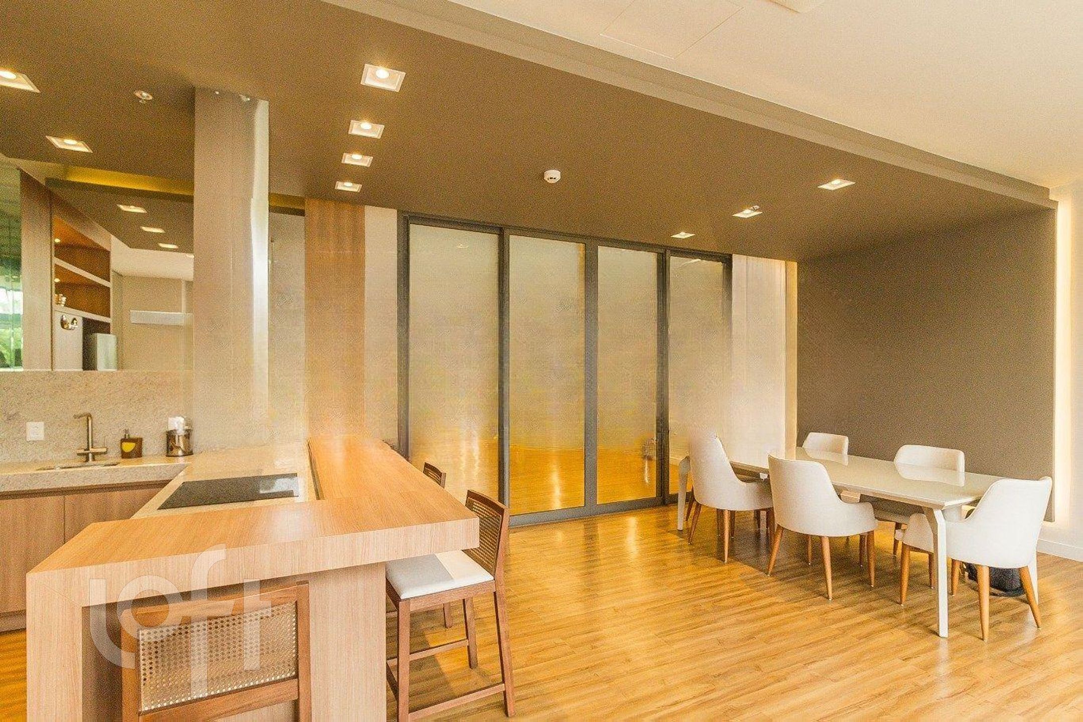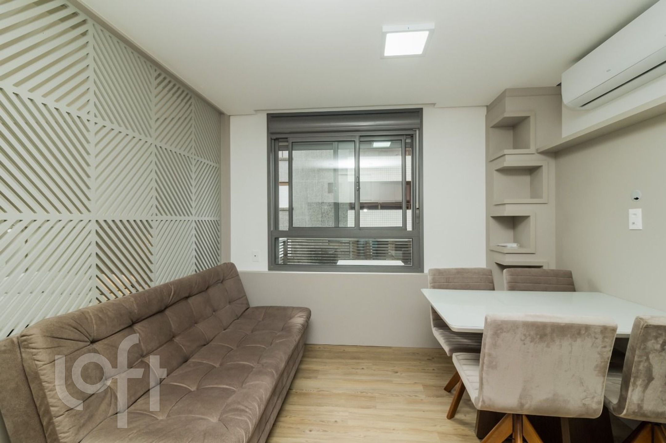 São 42 m de área privativa, onde estão distribuídos: 1 dormitório com armários, TV e cama, living com divisória para o dormitório com armários, sofá, mesa com cadeiras e ar condicionado split, cozinha com pia, armários, cooktop por indução, forno embutido, geladeira, microondas e máquina lava e seca, banheiro social com box e armário.
