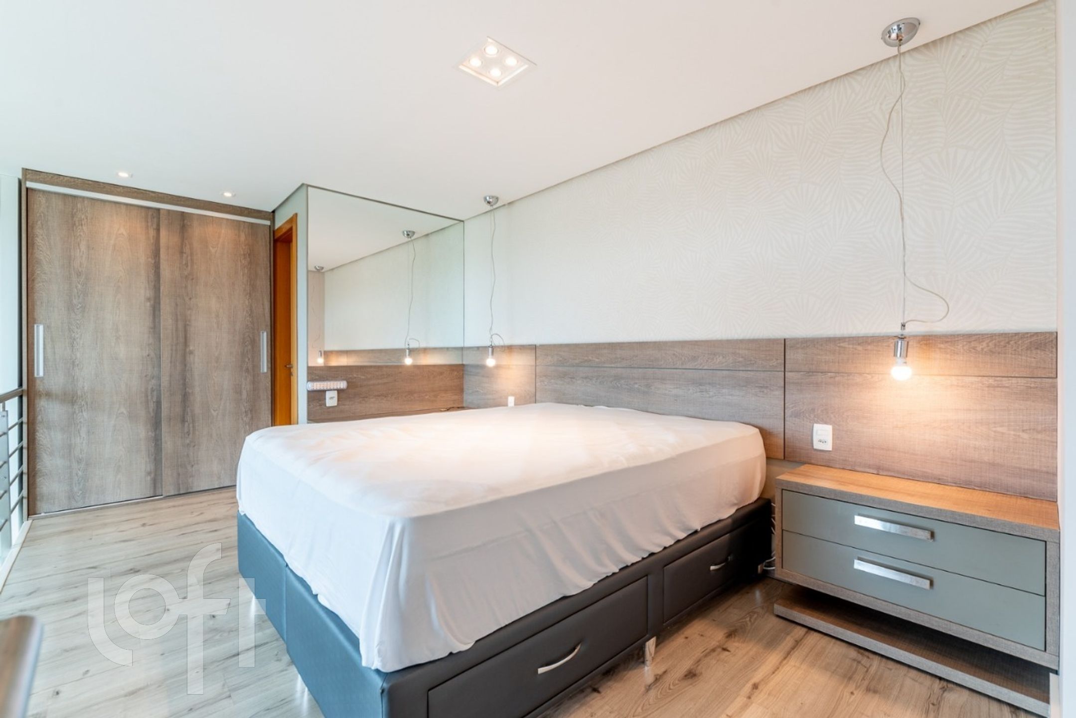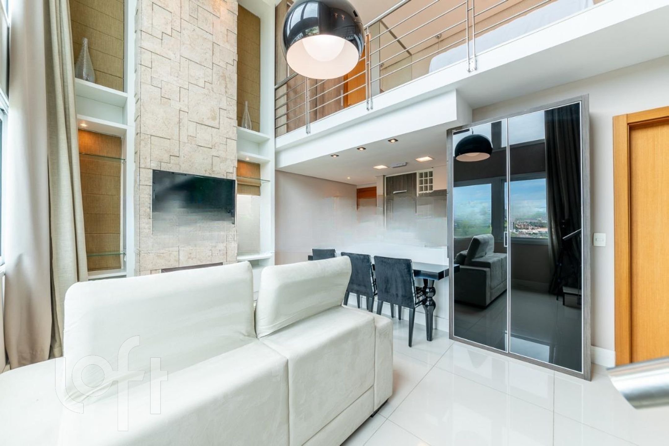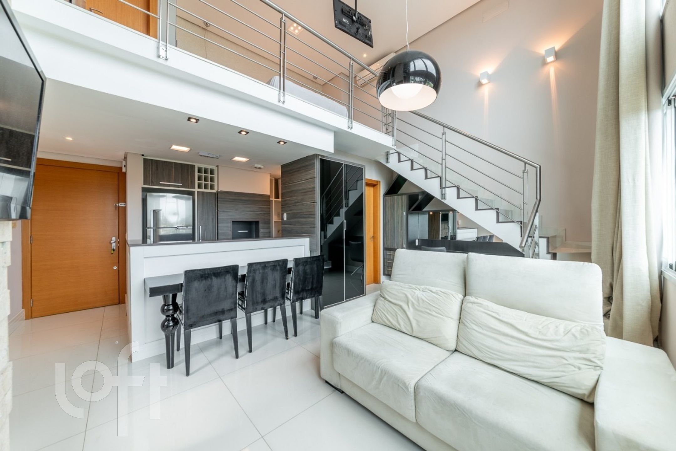 A distribuição interna do loft é muito bem planejada, com um espaçoso living de dois ambientes, lavabo, cozinha com área de serviço e um mezanino que abriga a suíte. Esse layout proporciona um ambiente amplo e aconchegante.
