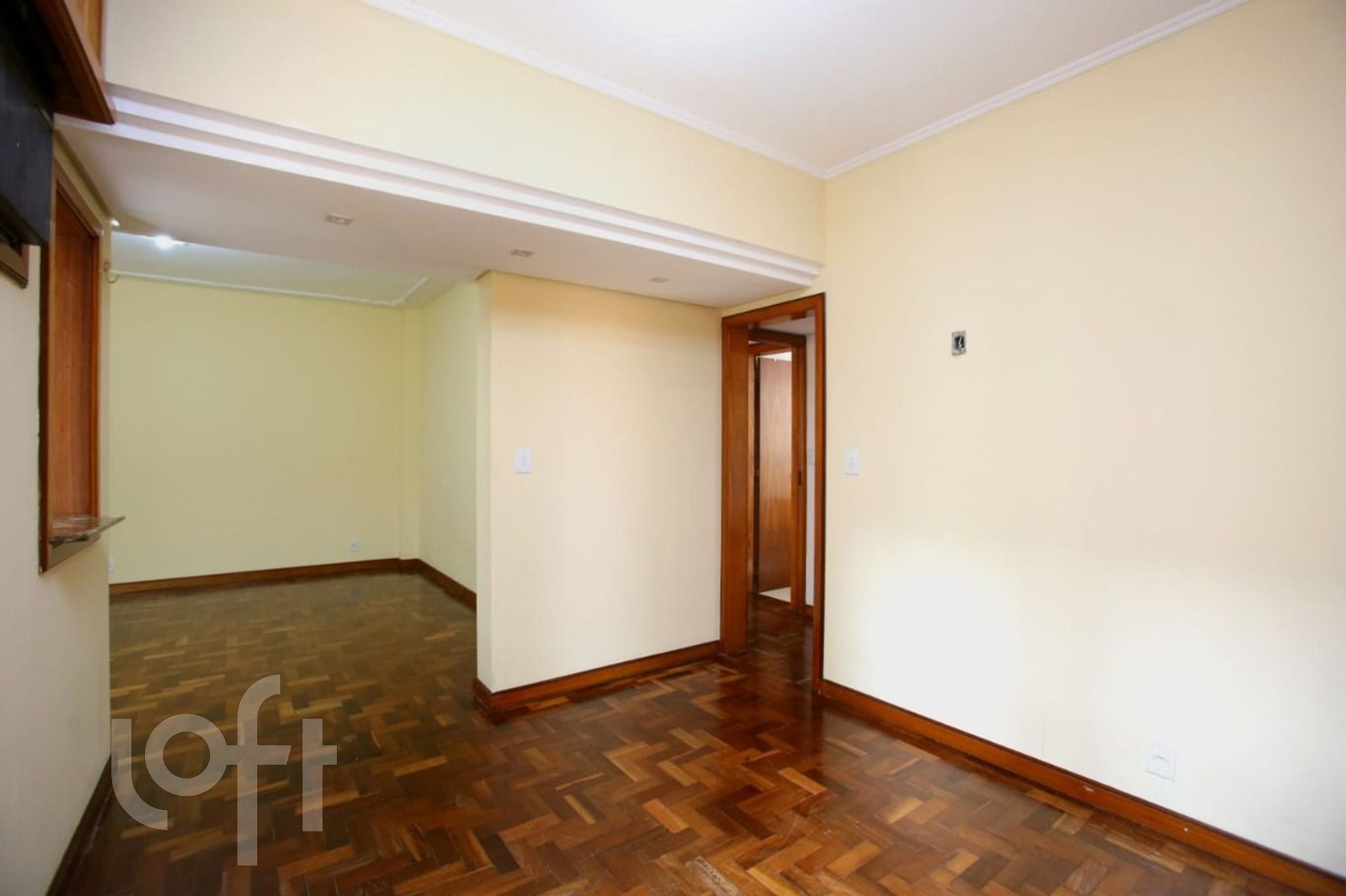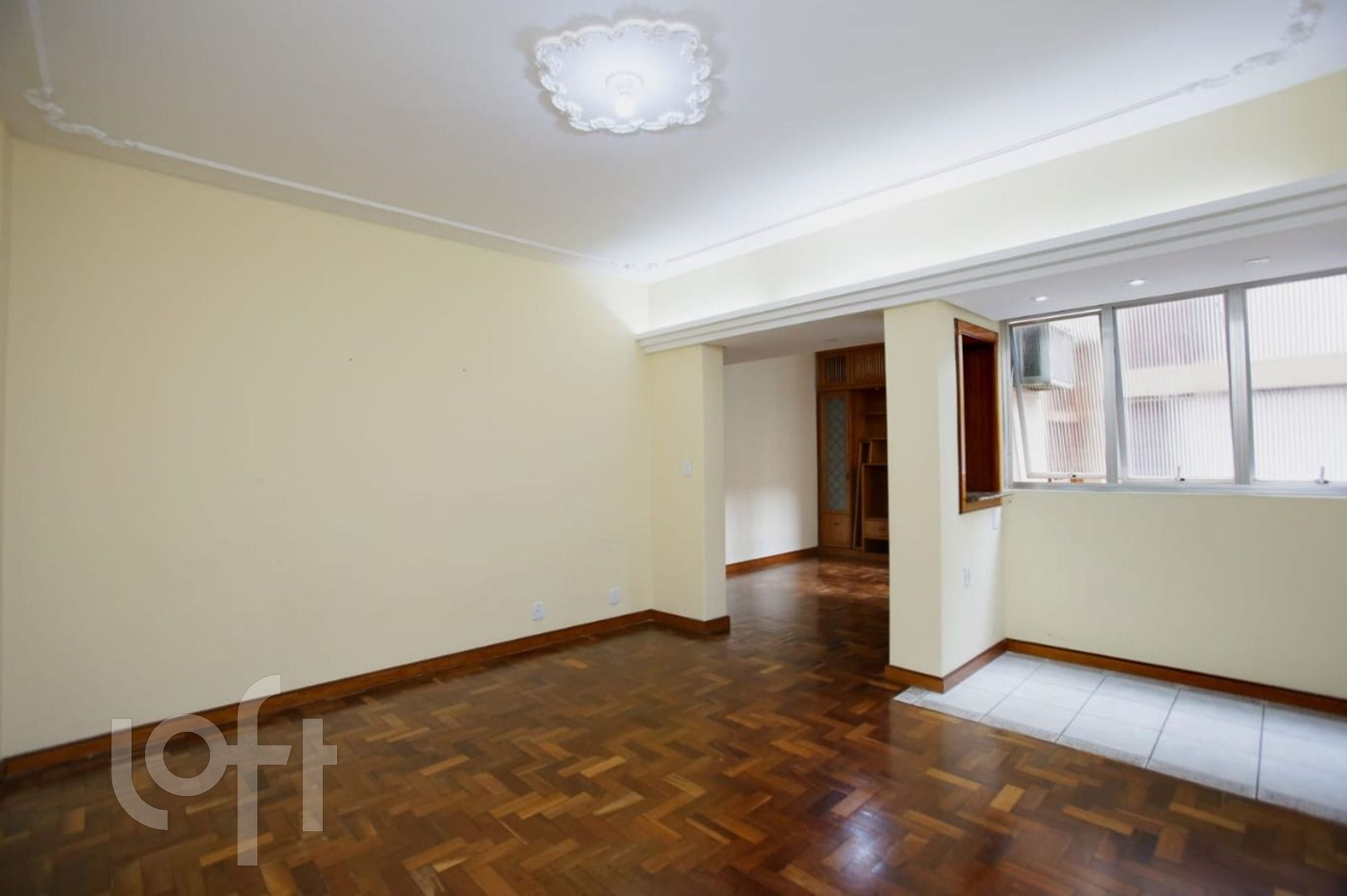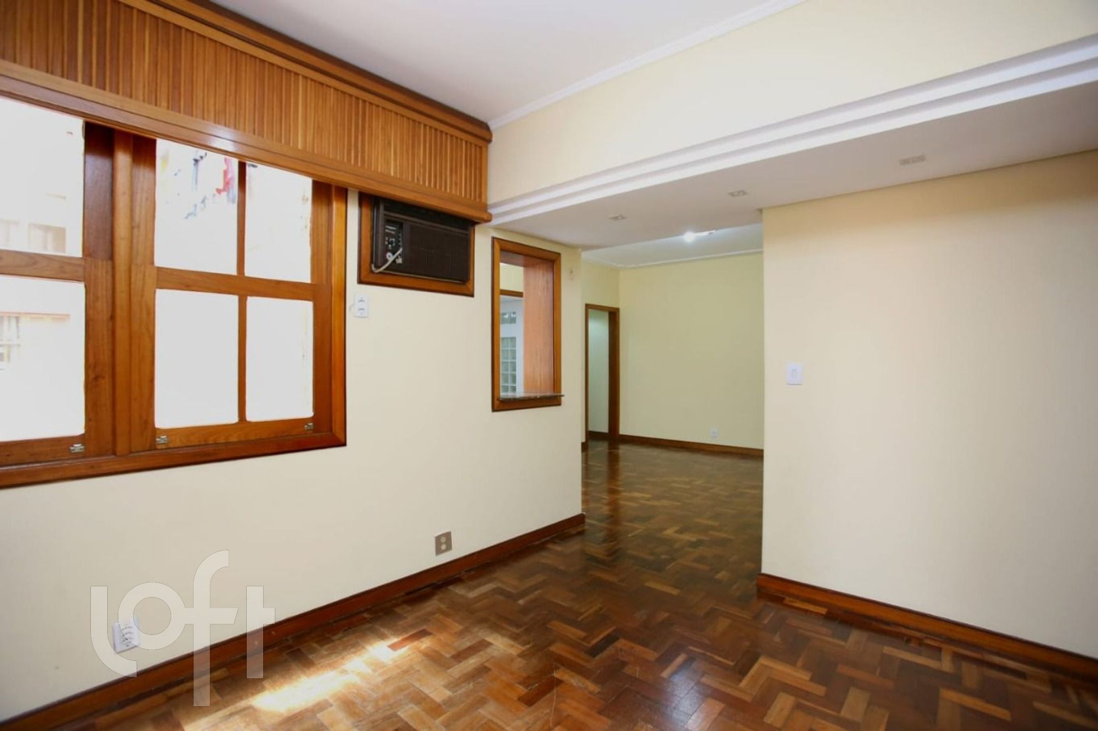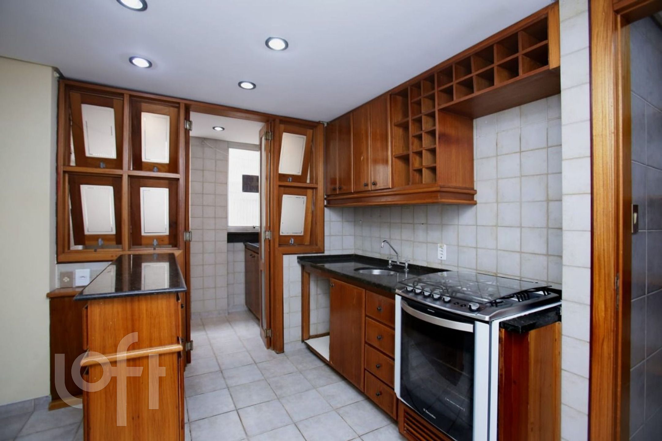 São 2 dormitórios (original 3), suíte americana, living em L, sacada aberta e cozinha americana montada.