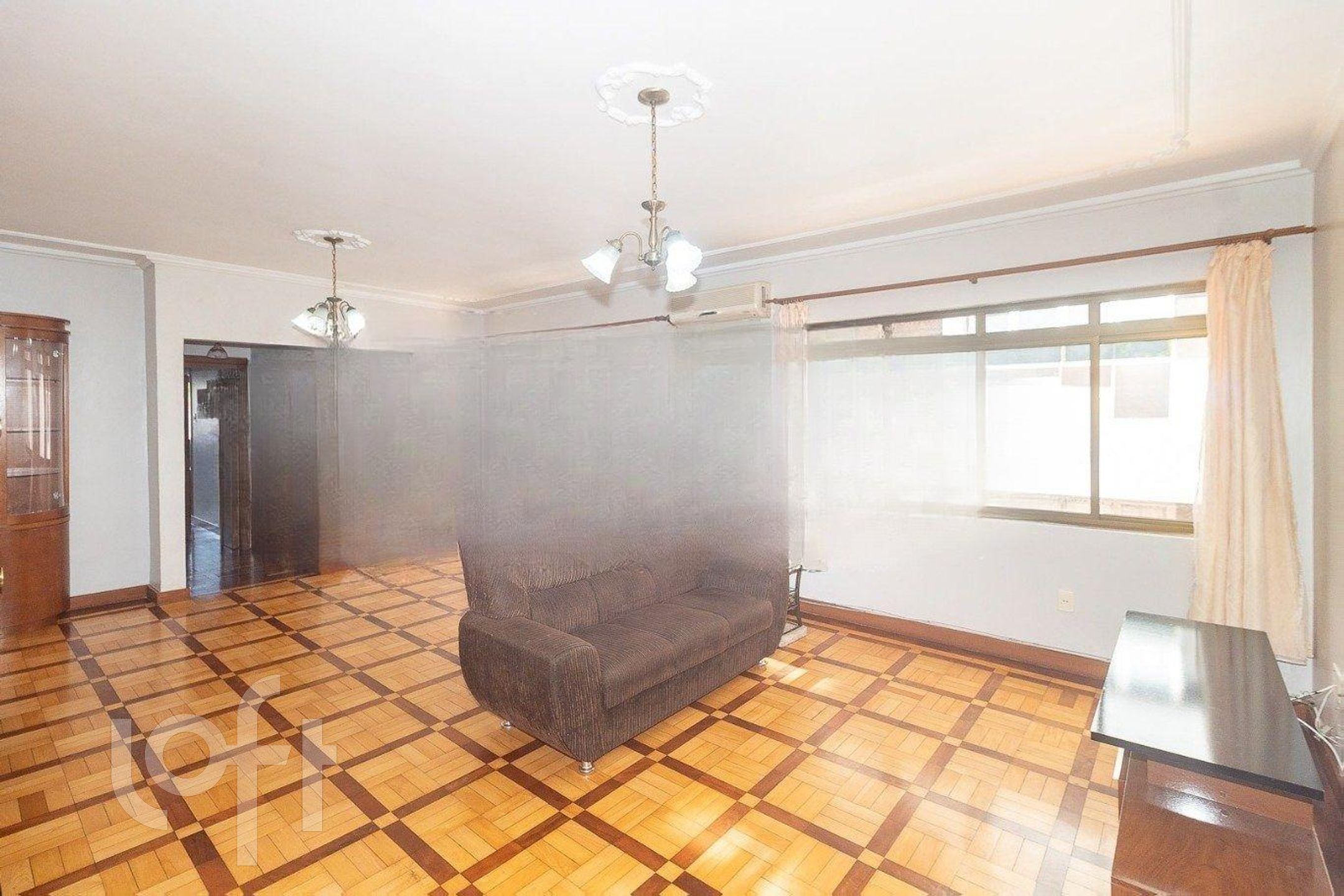 O living é amplo, com janelões que garantem muita luz natural durante o dia, e cozinha grande. O banheiro social tem banheira de hidromassagem e armários, além de um lavabo e um banheiro auxiliar.